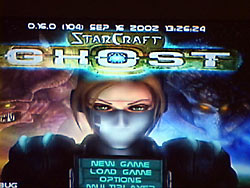 | 本邦初公開? "Ghost"のオープニングスクリーンだ。デジカメ撮影なので若干色味が狂っているが,ほぼ現物どおり。コンシューマゲームらしい,ややビビッドな色遣いが映える。真ん中は主人公Novaの素顔(?) |