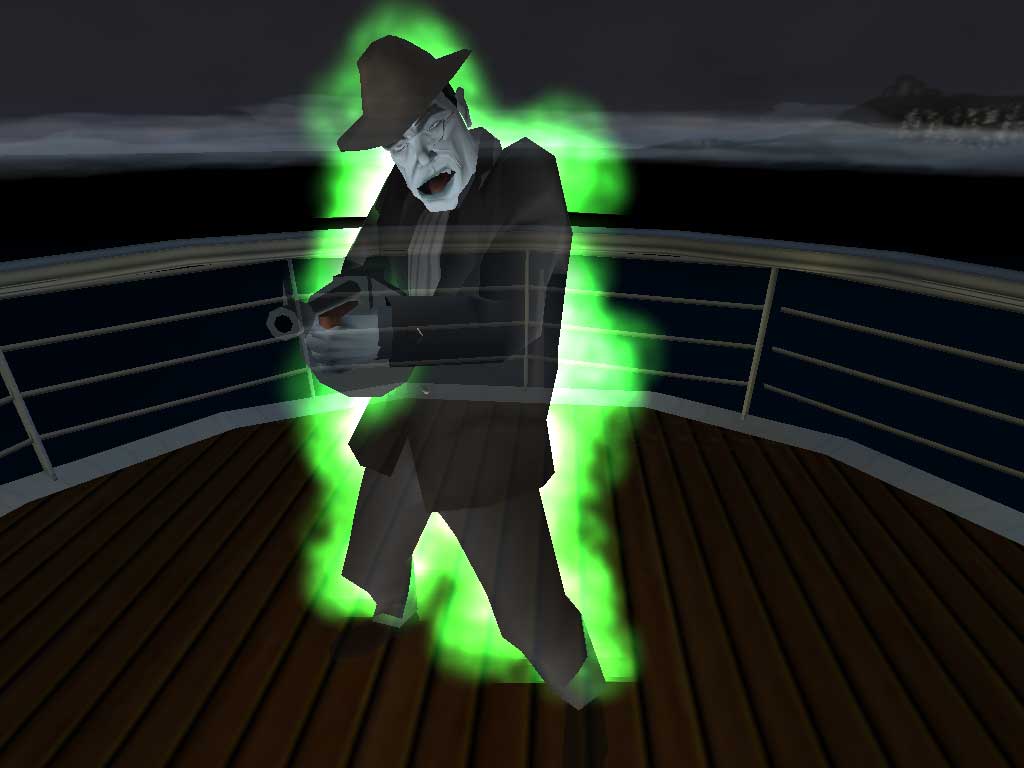 | 幽霊船レベルでの1シーン。ゴーストの"マローン"は,その昔にはギャングの一味だったのだろうか |