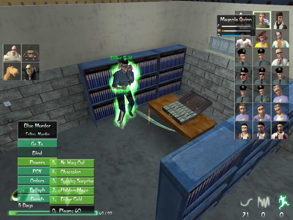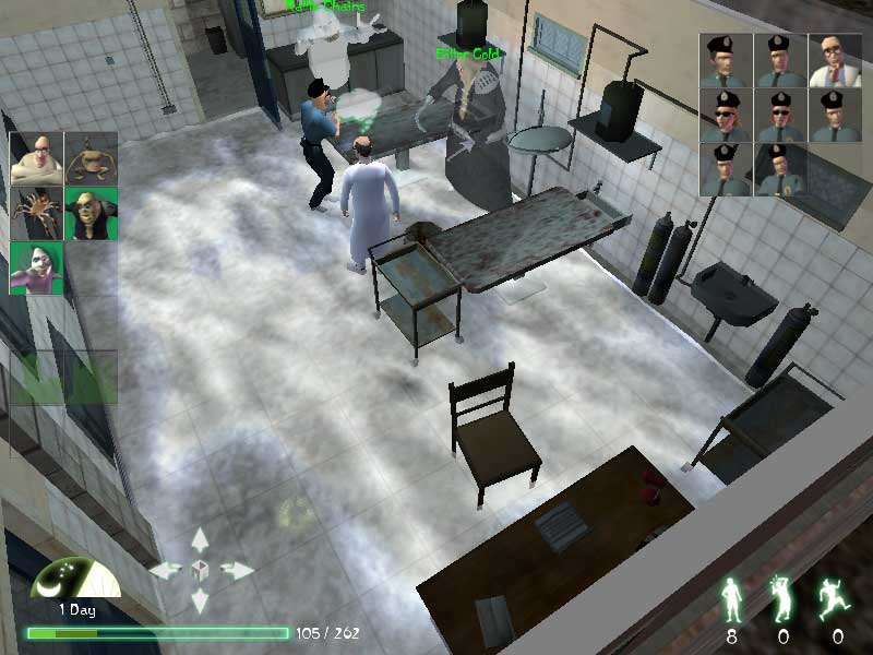 画面左上の四つハウンターのアイコンは,現時点でどのハウンターが使用できるかを示している。また右下の三つの数字は,左から,何人の人間達がいるか,どれだけパニックに陥っているか,そして何人が逃げ出したかを表す |