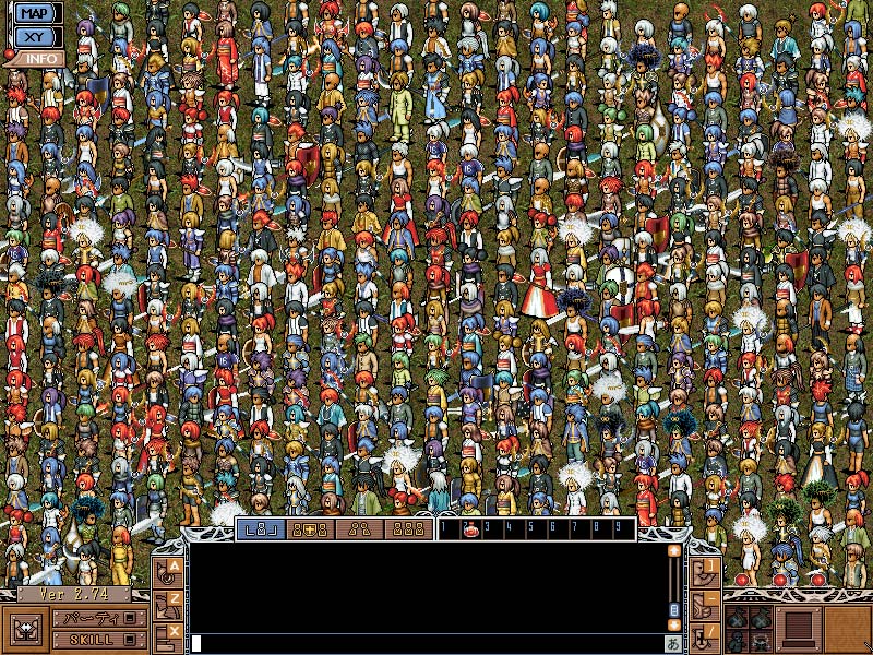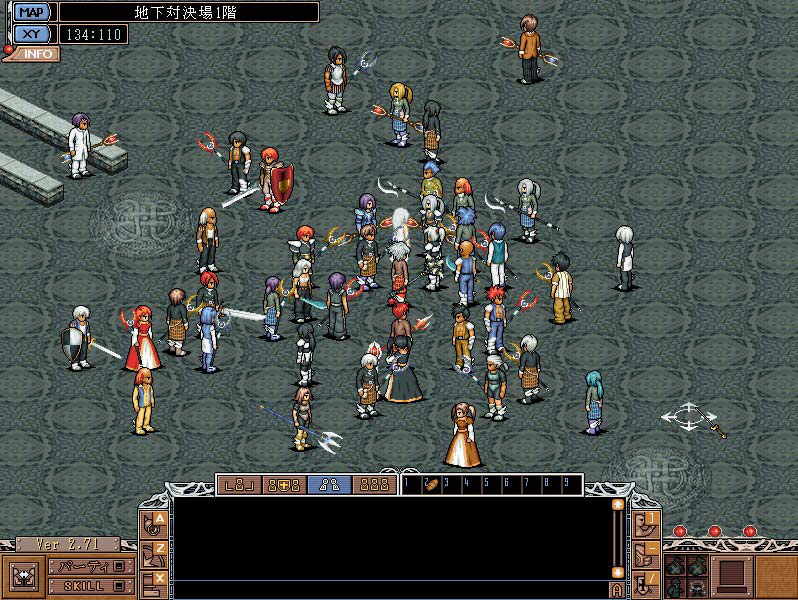 と,そんな風に書くと「ガディウスは大変血生臭いゲームか?」と思われてしまうかもしれない。だが,実際のところは使いやすく読みやすいチャット画面のおかげもあり,プレイヤー同士で楽しく雑談している光景があちらこちらで見られる。もちろん,殺伐とした世界は好まない,という人のためにプレイヤーキルが不可のサーバーも用意されており,こういう部分でも,自分の嗜好に合わせた選択ができるのだ。