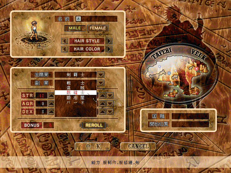 これはキャラクターの外観に限った話だけではない。キャラクターメイキングの際にプレイヤーはまず職業を選択することになるが,ベースとなる主職業が「戦士」「剣闘士」「盗賊」「魔法使い」「聖職者」の五つのうちから選択できるうえ,それらの職業に「裁縫師」「鍛冶屋」「錬金術師」「バード」という四つの副業(および一部の主職業)から任意のものを組み合わせることができるのだ。主職業の選び方によっては選択できない副業もあるのだが,その組み合わせは合計で30通り。成長システムは「レベル」+「スキル」+「ポイント」制となっており,意図的に合わせるなどしない限り,外見同様,これらがまったく同じキャラクターも,ほぼ皆無だろう。