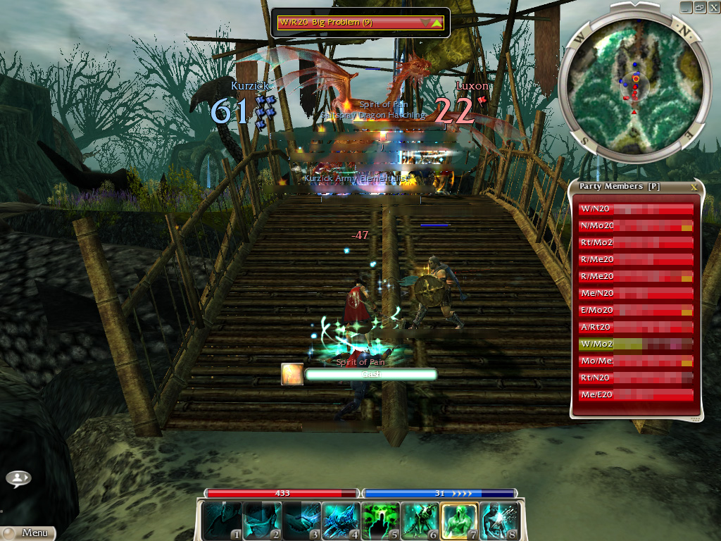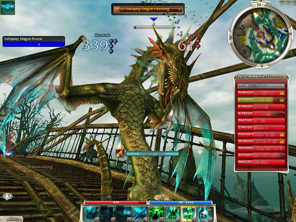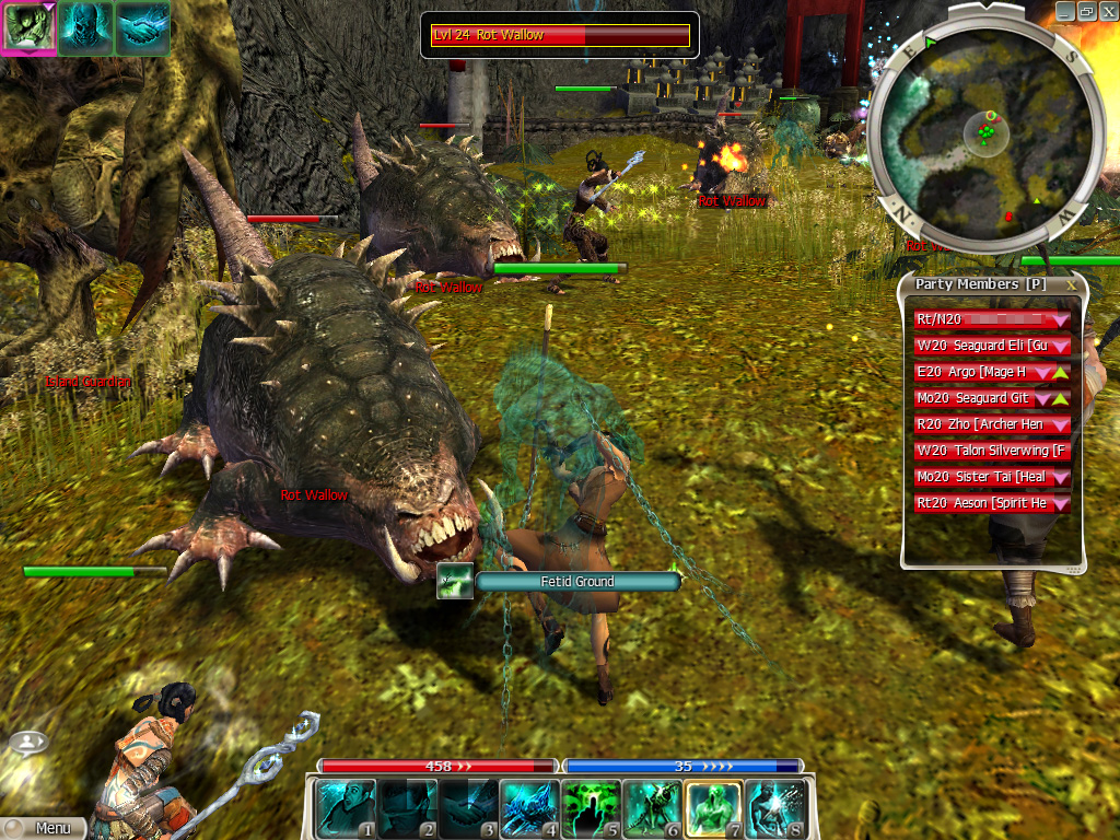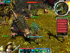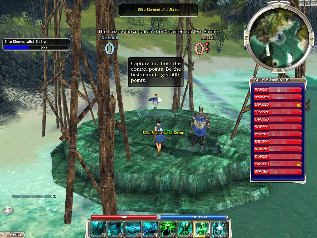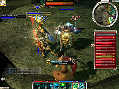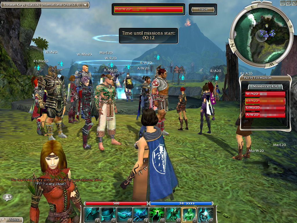 同盟バトルに参加したくなったら,ラクソンまたはカーツの首都エリアにいるNPCに,戦場用マップへ転送してもらう。試合人数は12名同士と,かつてない大規模戦である。とはいえグループの編成は思いのほか手軽で,最初に必要なプレイヤーは最少で1名,最大でも4名だけで構わない。すなわち,複数の4名グループが試合開始時にランダムで組み合わされ,合計12名のチームが出来上がるという寸法だ。