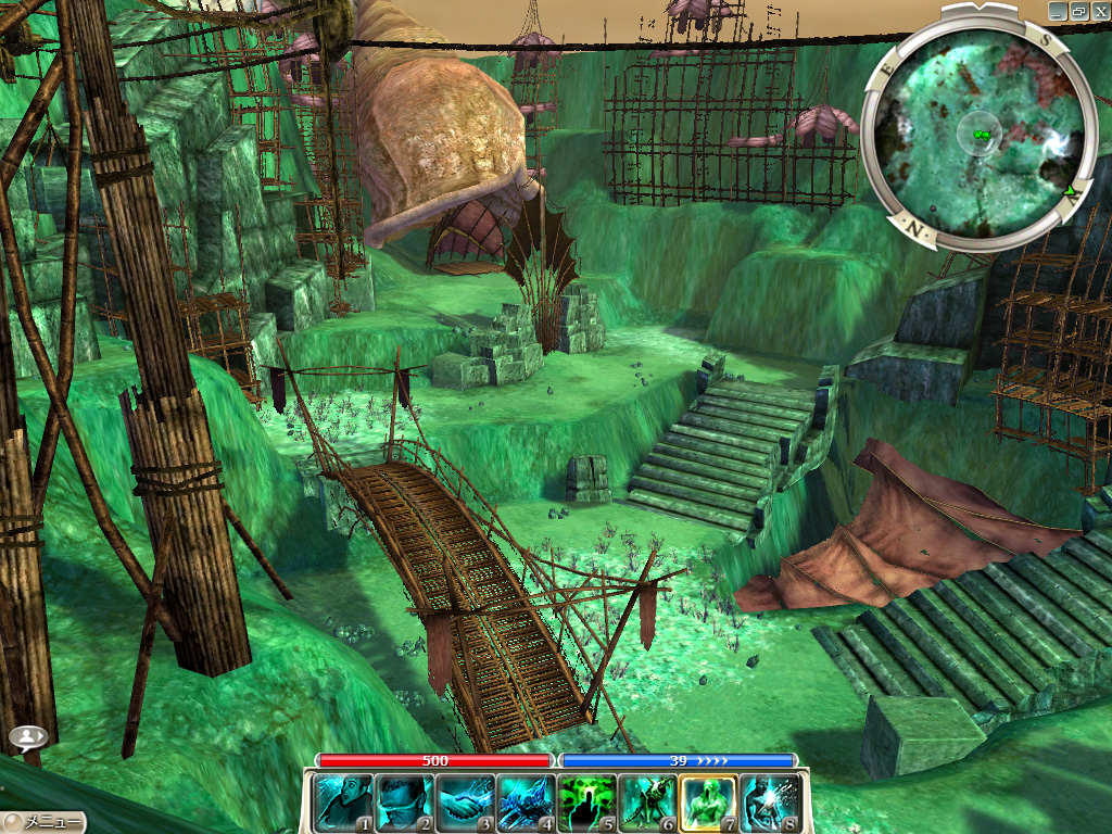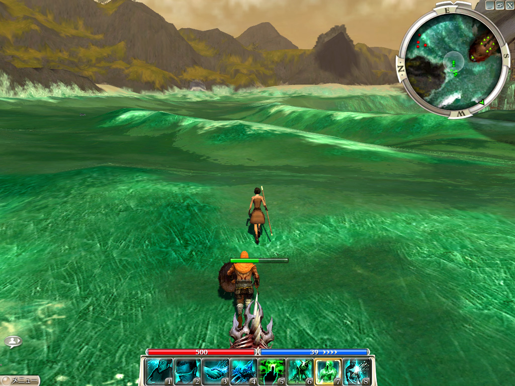 キャンサ帝国の拠点から東へ進むと,ラクソンの勢力範囲,南はカーツという地理構成となっている。とりあえずラクソンの首都へ進路を取ってみたが,歩いていくにつれ地形が少しずつ変わっていった。そして,なんと海が完全に硬化しており,その上でラクソンの人々が生活を営んでいるではないか。NPC達に話を聞いてみると,ラクソンはかつて海洋民族だったものの,先述した皇帝暗殺時に発生した「ジェイドの大風」によって大陸の地形が変わり,生活の変化を余儀なくされたらしい。