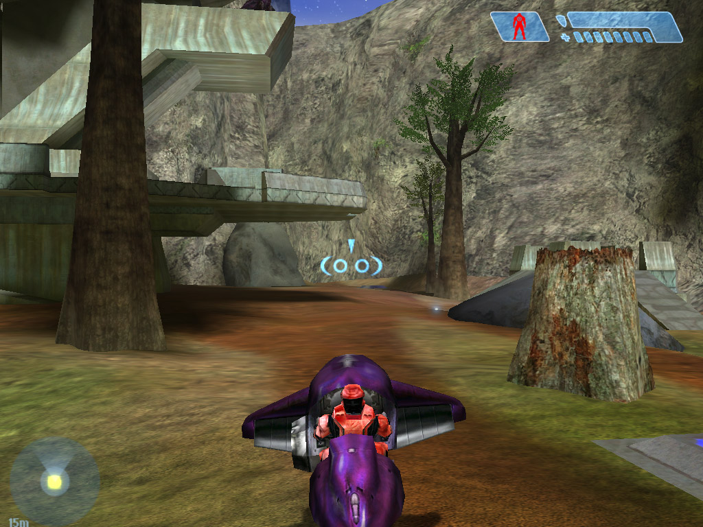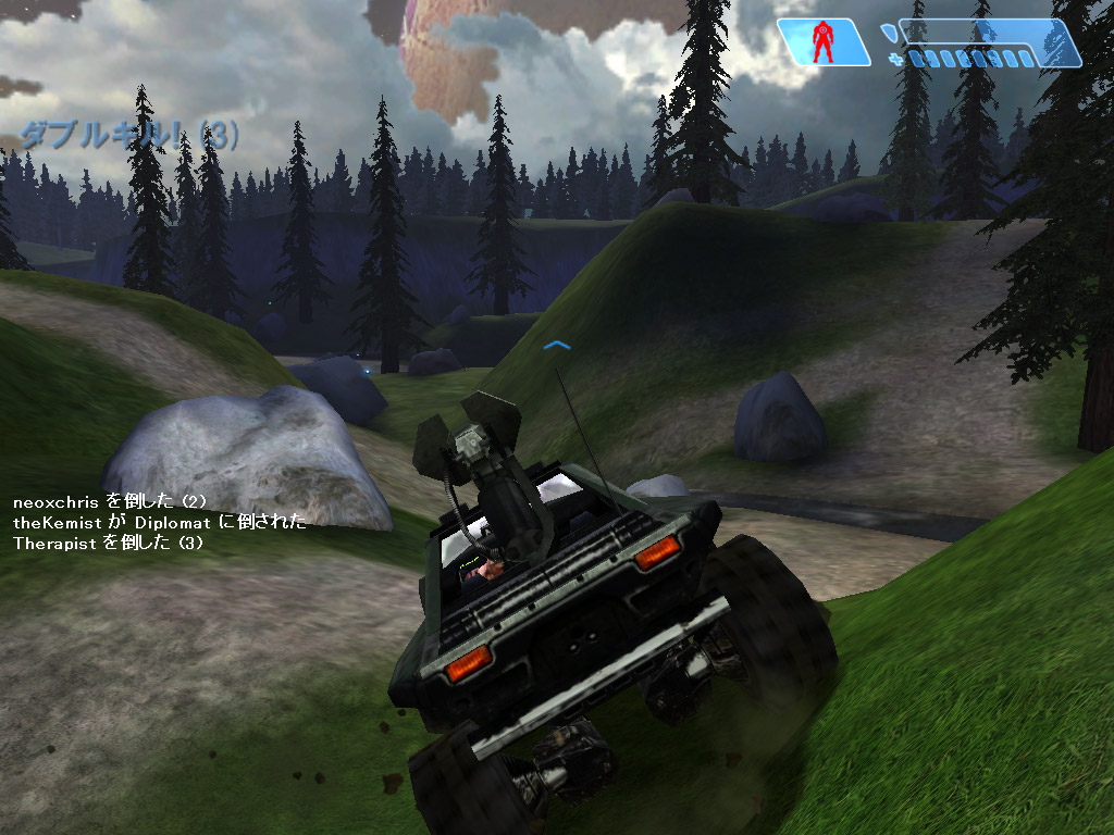 | ワートホグで2名同時の轢殺を決めた直後(ダブルキル)。ワートホグは本来ガンナーがいないと攻撃できないが,ドライビングテクニックがあれば,こんな使い方も |