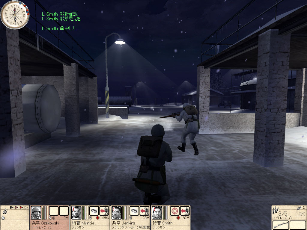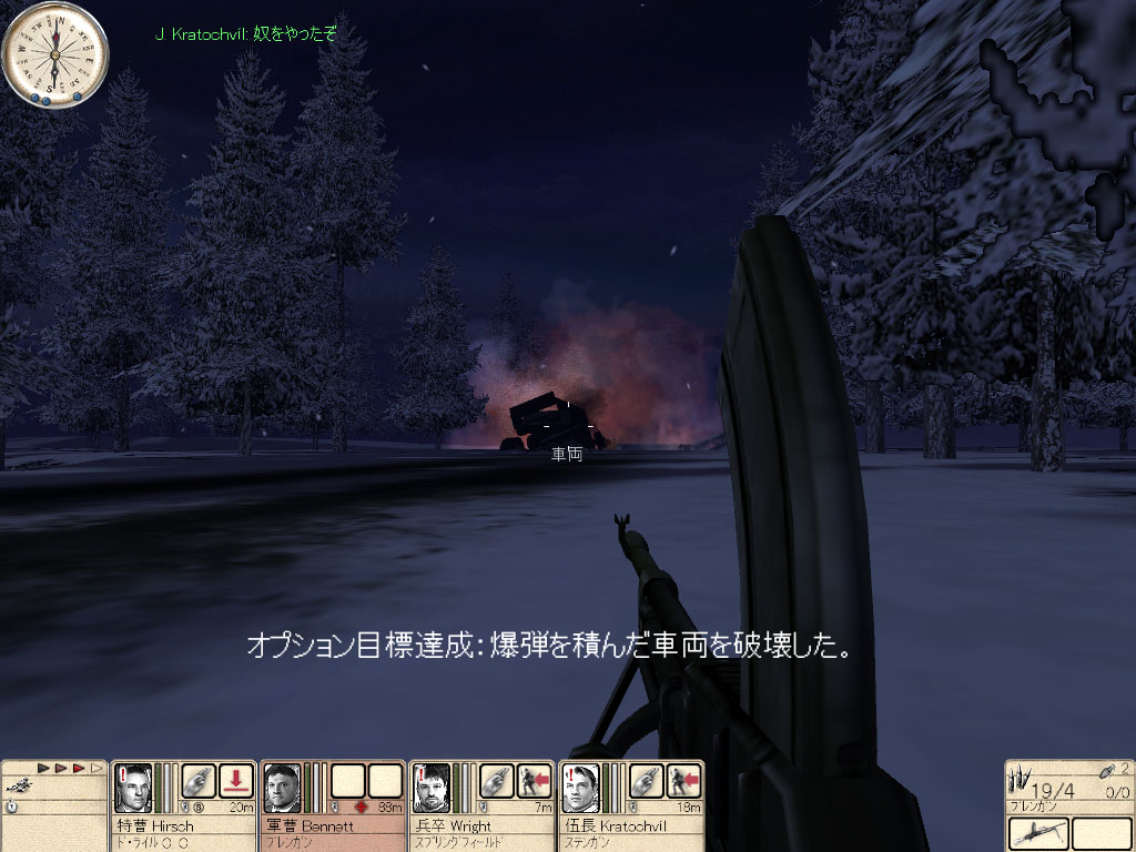 (え)の部分に,ぬかるみにはまったトラックを押しているドイツ兵の姿が見られる。困っているので手を貸してあげよう……ではなく,もちろん殺すしかないのだが,このトラックを破壊するのをお忘れなく。オプション目標「爆弾を使ってトラックを破壊する」が達成される。別に装備の爆弾やダイナマイトを使用する必要はない。ただ壊せばいいのだ。