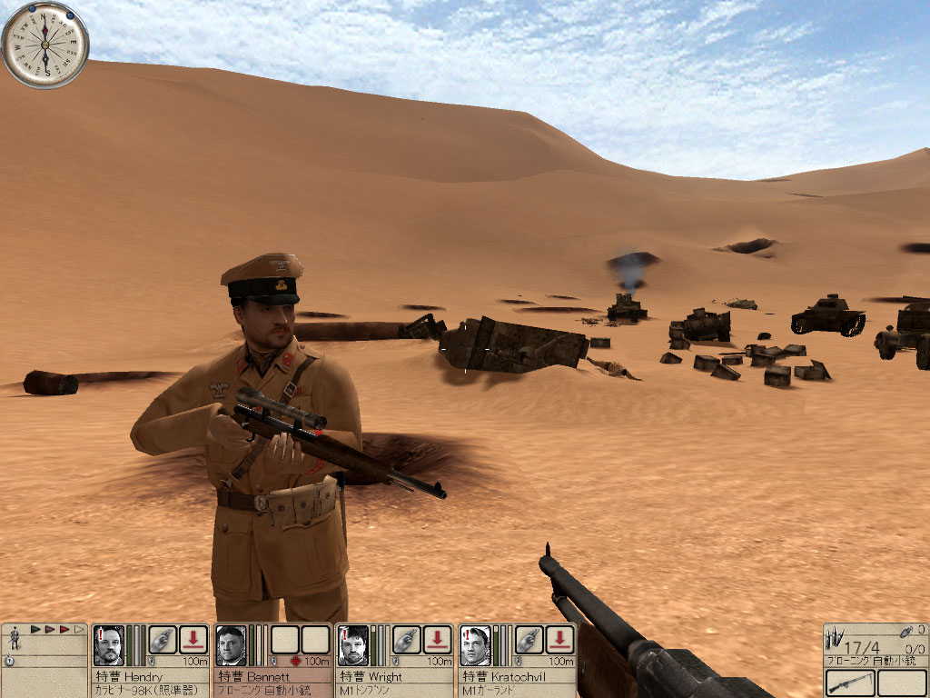 広大な砂漠を,スタート地点から(え)のゴール地点まで,ただ突っ切れば良い。ただし1本のルート(マップ参照)からはみ出してしまうと,地雷の餌食となる。地雷は目に見えるが撤去はできないので,あまり馬鹿なことは考えないように。そしてルート上には,攻撃を受けたドイツ軍の補給部隊が立ち往生しているという。大変いい迷惑だ。