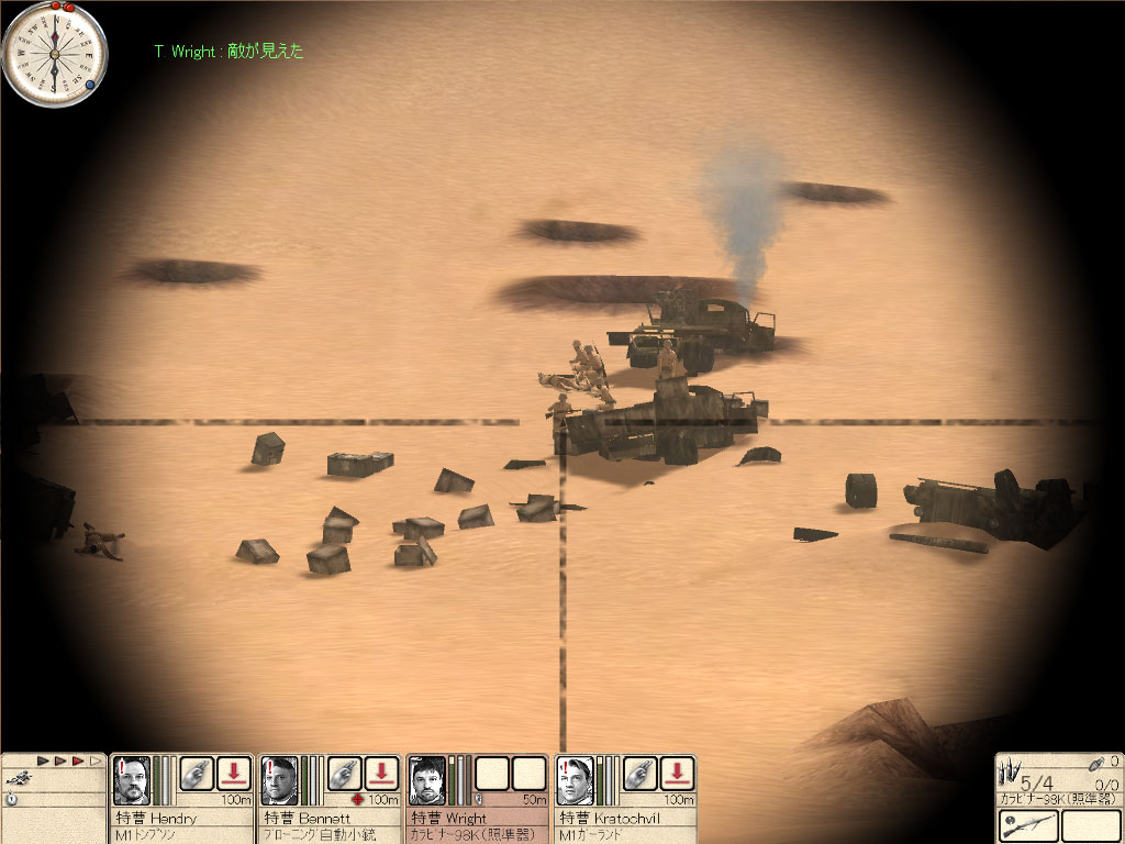 (い)のFlak38付近には,敵兵士が何人か集まっている。この中でもっとも手前にいる兵士は,実は通信機の前にいるのだ。こちらの襲撃が発覚すると,こいつは通信機を使って味方に応援を要請してしまう。狙撃するなどして,こいつを直ちに殺害すれば,オプション目標「敵は援軍を要請することができなかった」が達成される。余談だが,この中には逃亡を図る敵兵もいる。一人でせっせと西のほうに走っていくが,最後は地雷を踏んでしまうというオチがついている。