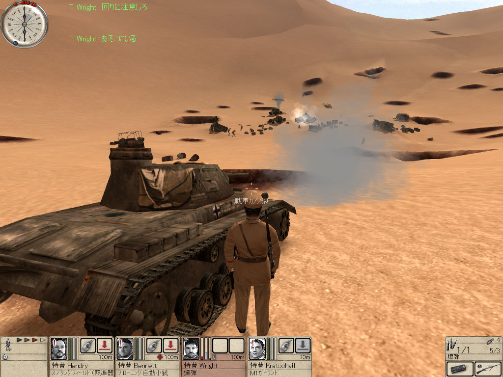 続いて,「変装」+「爆弾」作戦。これはもちろん敵の制服と爆弾を持っている場合だが,いくら変装できるといっても(い)の中には入っていけない。そこでまず,こちらの存在を相手に気づかせてから後退し,戦車がジリジリとこちらに向かってくるのを,爆発跡の孔の中で待つ。敵兵は来ないが,戦車だけはこちらに向かってくるので,あとは横から近づいて爆弾をくっつけるだけ。(あ)で入手したパンツァーファウストを使う場合も,同じように誘き寄せる戦法がいいだろう。