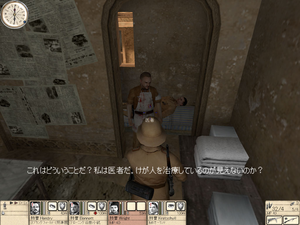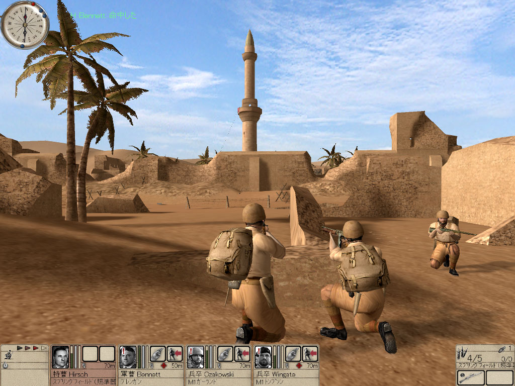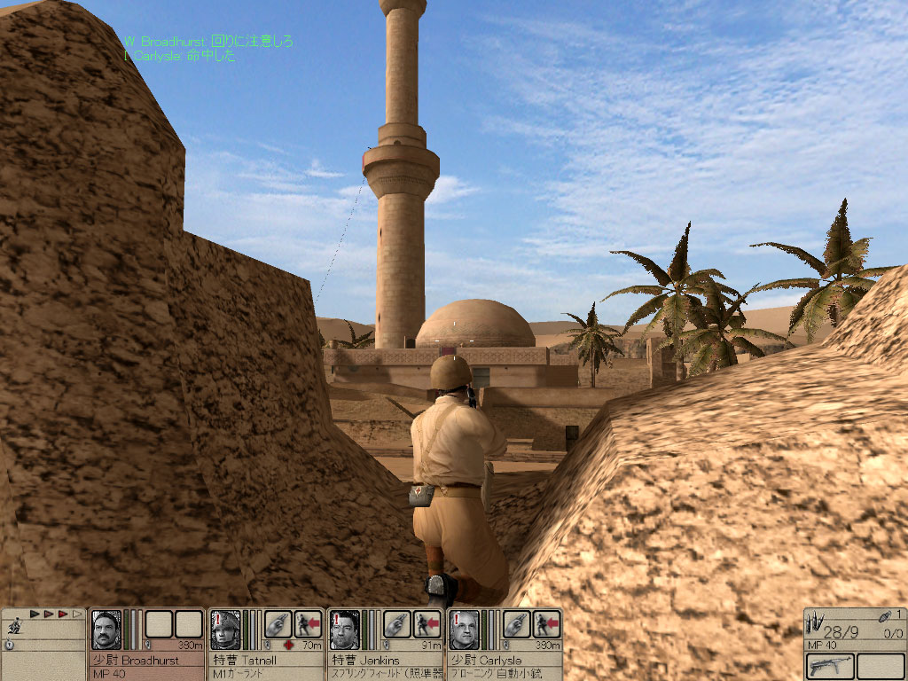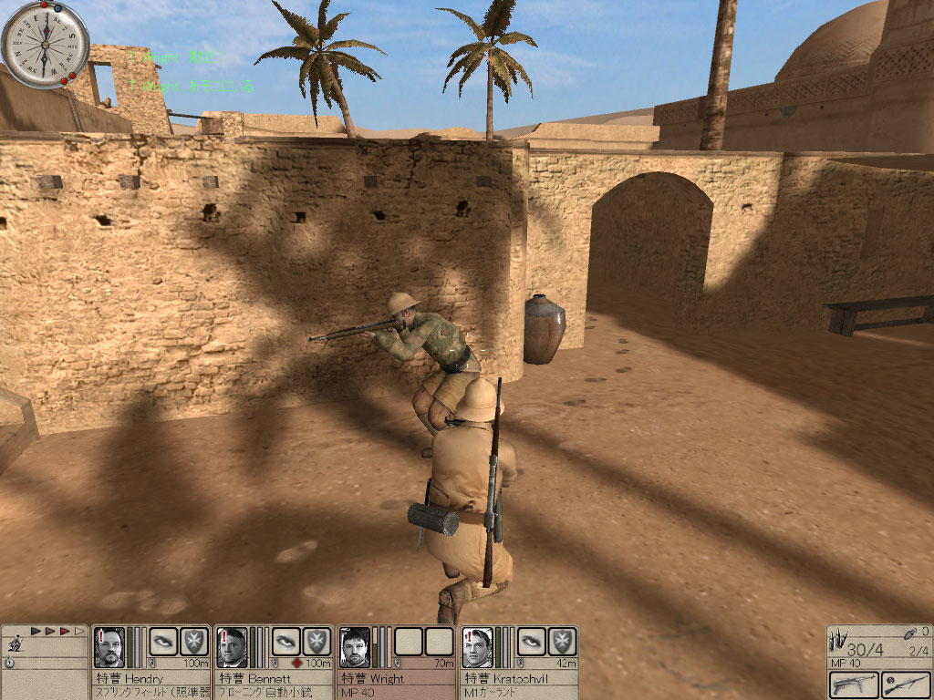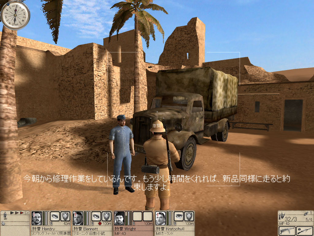 オアシスに建設されたモスクをドイツ軍が占領している。とても居心地が良さそうなので連合軍が使いたい。だから4人で奪い取れ。という,軍部からの命令は正直どうかと思うが,塁壁に守られたオアシスを奪取しなければならない。すべての敵を排除し,(あ)にある通信機で報告する。また車両を確保するため,(い)の修理工と接触する必要がある。修理工またはトラックを失うとミッション失敗だ。