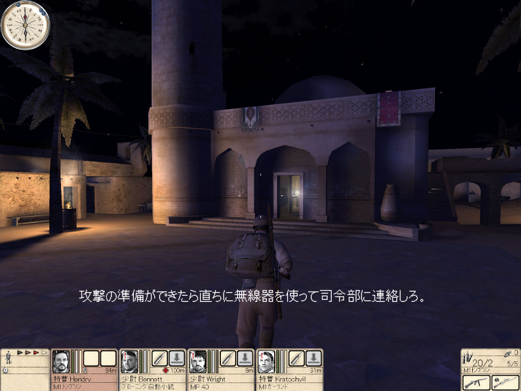 先ほど制圧したオアシスに,敵部隊が向かっている。今度は4人で死守しなさい。というのが,司令部の意向というか命令だ。チームメンバーをそれぞれ任意の位置に配置し,(あ)の通信機を使うと,いよいよ敵が向かってくる。敵の歩兵部隊を壊滅させ,戦車を破壊すれば敵は撤退してミッション成功。こちらのトラックを破壊され,さらに相手のトラックも破壊してしまうとミッション失敗となる。