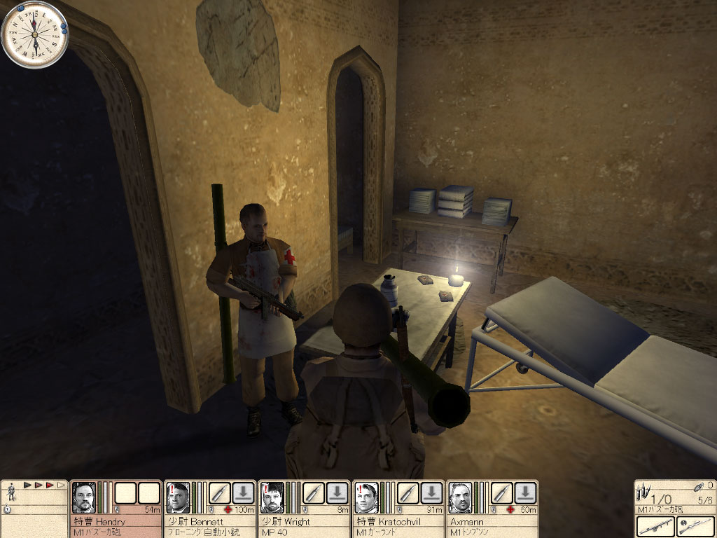 問題は戦車だが,まだ爆弾が残っているなら,「変装」+「爆弾」で簡単に破壊できるだろう。爆弾はここで使い切っていい。なければバズーカかパンツァーファウスト(敵兵が持っている)を使って倒すしかない。