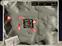 最初は,南東から北に向かってトラックと戦車が来る。プレイヤーは(う)の機銃を担当し,戦車を発砲せずに見送ったら(そうしないと戦車に殺される恐れがある),すかさず担当を(い)に移す。(う)の機銃は,あとはAIに任せよう。(い)では先ほどの戦車と,トラックがやってくる。このトラックから敵兵士が降車する前に機銃で破壊。それが終わったら,もう(い)の機銃に用はない。ここの兵士は,同じ位置から塁壁の内側に監視の目を光らせよう。(え)の位置に装甲車が停車して歩兵が現れるので,これを始末させるといい。