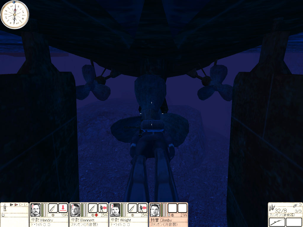 ![]() 「ヒドゥン&デンジャラス2」中,最短の1ミッションで構成されるキャンペーン「シーウルフ作戦」。潜水服とアクアラングを着用し,ドイツの戦艦と掃海艇に海中から接近・侵入・破壊するミッション。必須装備の磁気機雷は別として,唯一必要な装備は消音銃。ド・ライルCCか消音器付きステンガン以外の銃は,敵味方を含め1発も発砲させてはならない。ほかには応急処置キット(小),コンパス。物好きな人はナイフを。