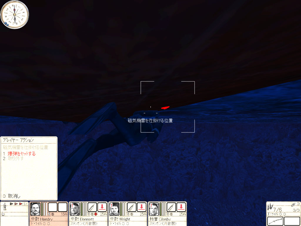 とりあえず磁気機雷は時限式ではないので,最初に全部設置してしまって構わない。まずはスタート地点の近くにある小型の潜水艦に乗って(見逃さないように!),目標軍艦の停泊地点まで移動し,さっさと機雷を仕掛けよう。ティルピッツに2個,オラフに1個だ。