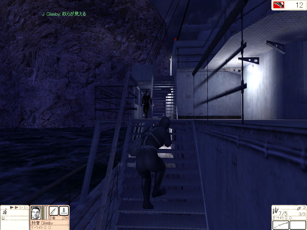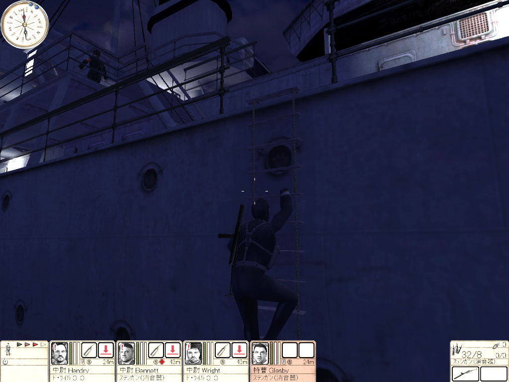 甲板上に敵兵が少なそうなタイミングを見計らって大胆に乗艦し,あとは素早く敵兵を始末していけばいい。敵兵はわずか12人で,うち3人が船の深部にいる。"敵に何発も発砲させない"ことと,"複数の敵に同時に発見されない"ことが大切だ。自分の背後に敵兵の見落としがないようなルートを選ぼう。