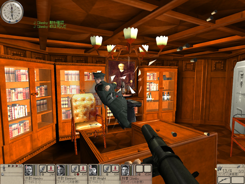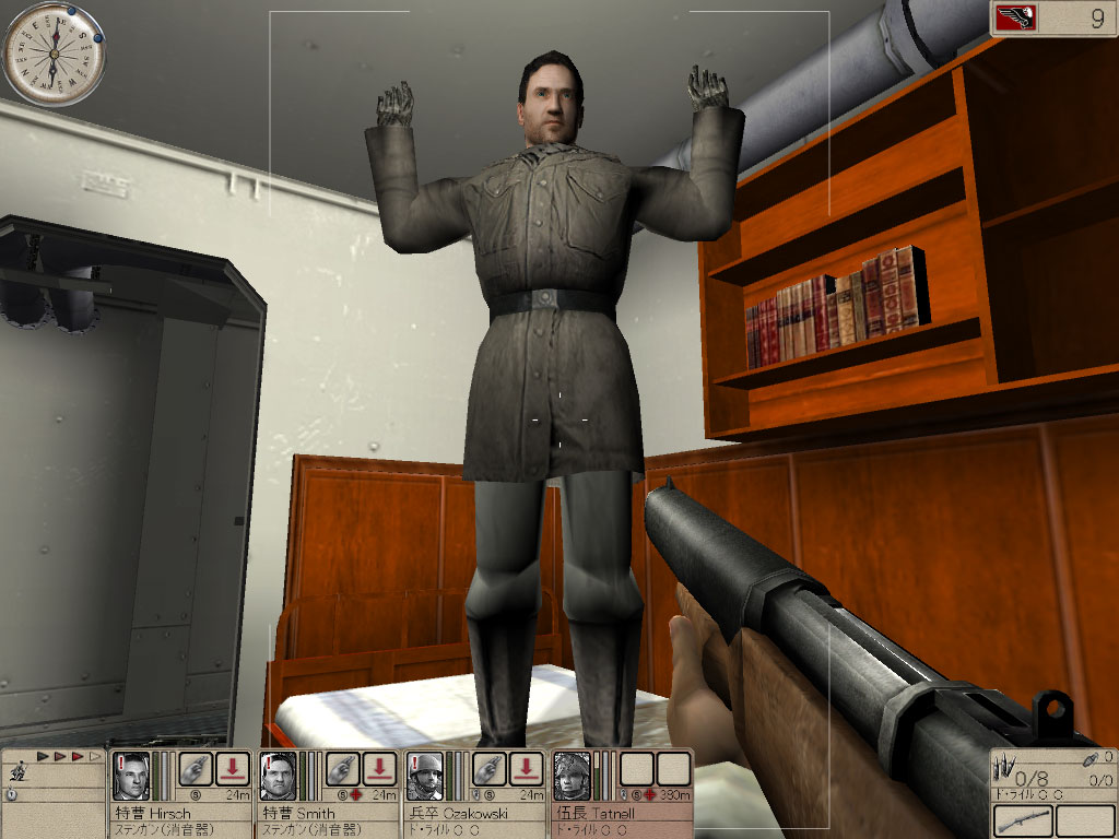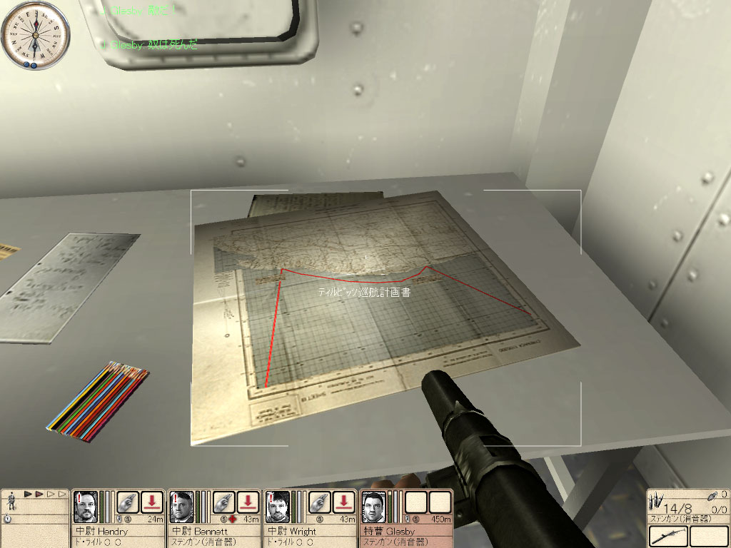 目的の品は艦長室にある。艦長室へ通じる扉は,船の右側(ティルピッツ側),1階のもっとも艦尾に近い扉。この扉の先にはたくさんの部屋があるが,とにかく一番奥に艦長がいる。さらにその奥,艦長の私室でエニグマを発見できるだろう。これを奪って12人の乗組員全員を始末し,さらに機雷を3個とも設置してあるなら,あとはスタート地点へ戻ってミッション完了となる。
