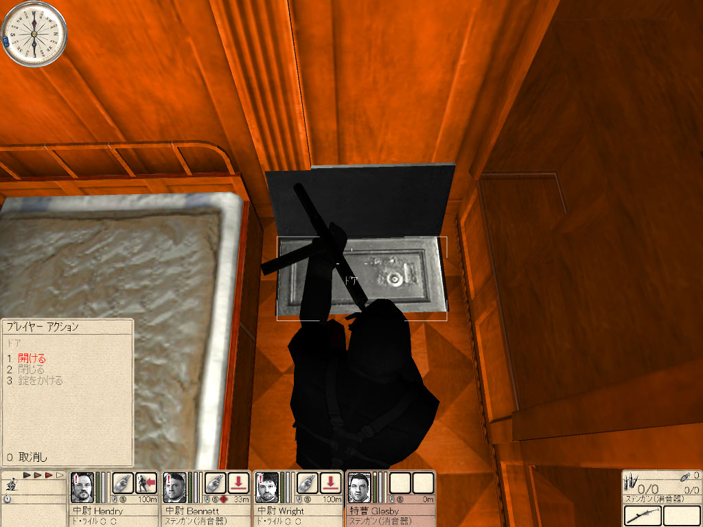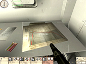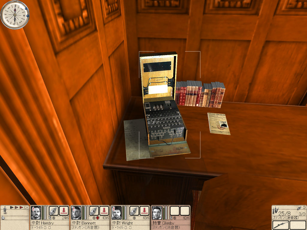 なお,艦長の私室のさらに一番奥,ベッドの横の床を注意深く調べてみると,隠し金庫が見つかる。中にはイギリス軍が喉から手が飛び出るほど欲しかった,エニグマ暗号帳が眠っている。これはオプション目標の品だ。もう一つのオプション目標は,2階の一番前方の部屋の机にある"ティルピッツ巡航計画書"を奪うこと。