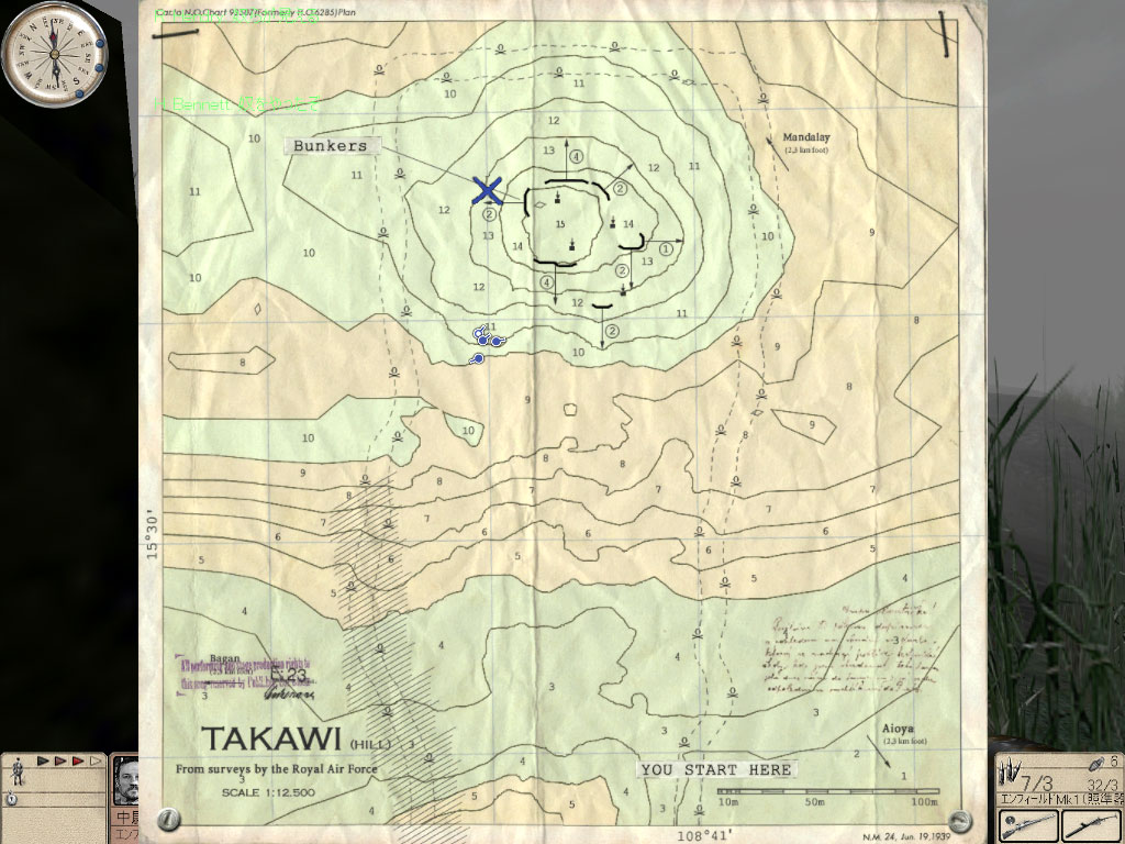 とりあえず地図を見てみよう。等高線の12〜14にかけて,頂上を取り囲むように太い線と,そこから垂直に矢印が描かれている。これが敵の掩蔽壕のおおまかな位置であり,矢印は機関銃の向きだ。地図を頼りに掩蔽壕の真正面に立たないよう死角から接近し,中の兵士を排除していく。または,無視して頂上を目指すのもアリだが。
