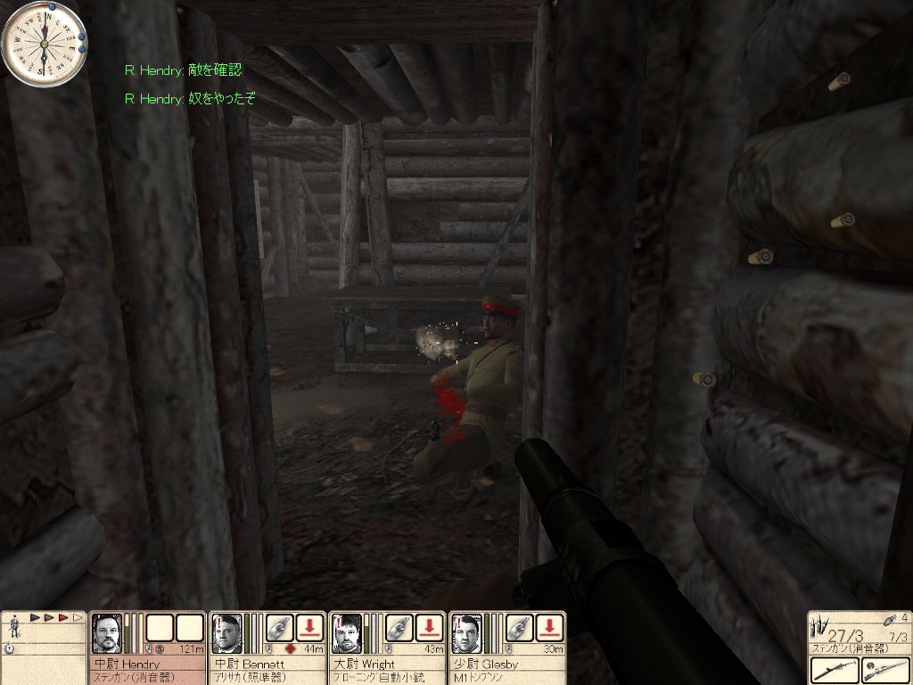トンネル内は入り組んでおり,思った以上に敵兵が多い。曲がり角の先や,部屋の一つ一つすべてに敵兵が潜んでいると想定して,常に手榴弾を放り込んでから先に進む。制圧条件は,敵兵の全滅ではなくて士官(衣装で見分ける)の殺害だが,もちろん全員殺したほうがいいだろう。