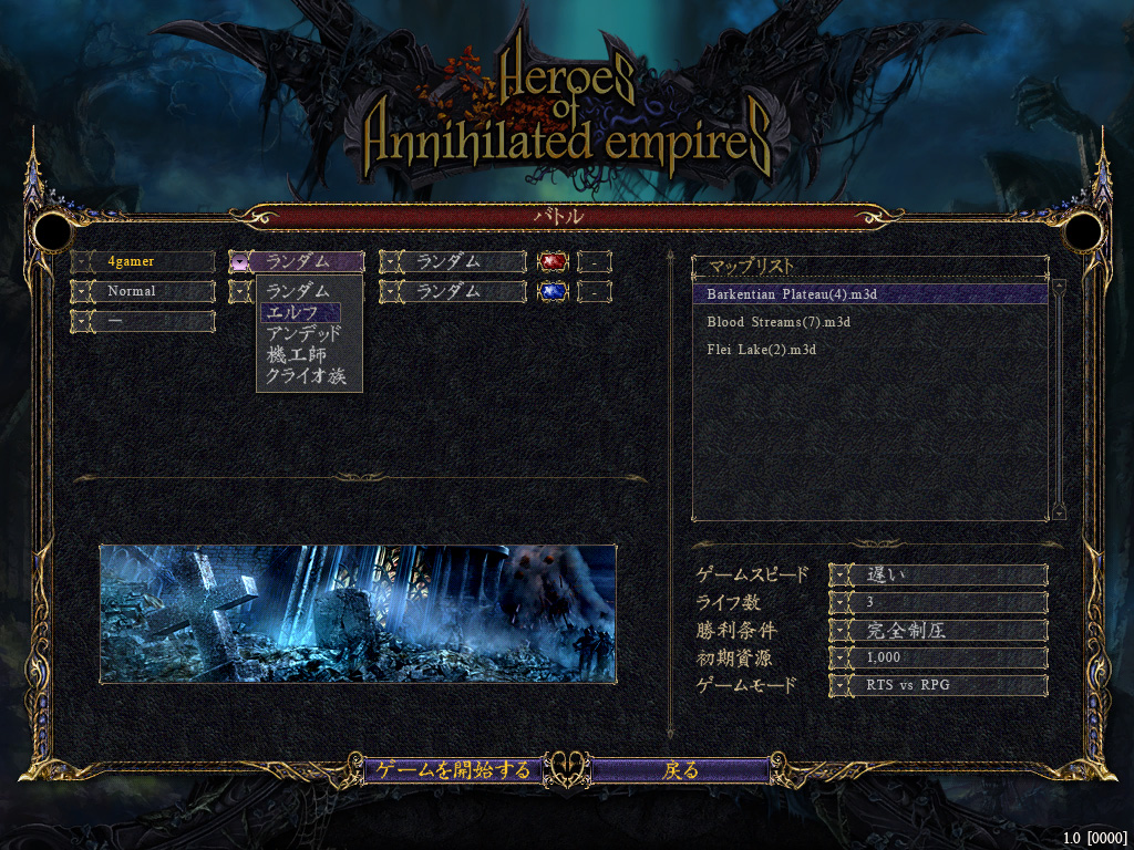 「バトル」は,使用種族やマップ,難度などを設定し,CPUを相手に戦うゲームモード。最大4勢力で戦う「Barkentian Plateau」,最大7勢力で戦う「Blood Streams」,2勢力で戦う「Flei Lake」という3種類のマップが収録されている。マップは今後,パッチなどによって追加されていく予定だ。