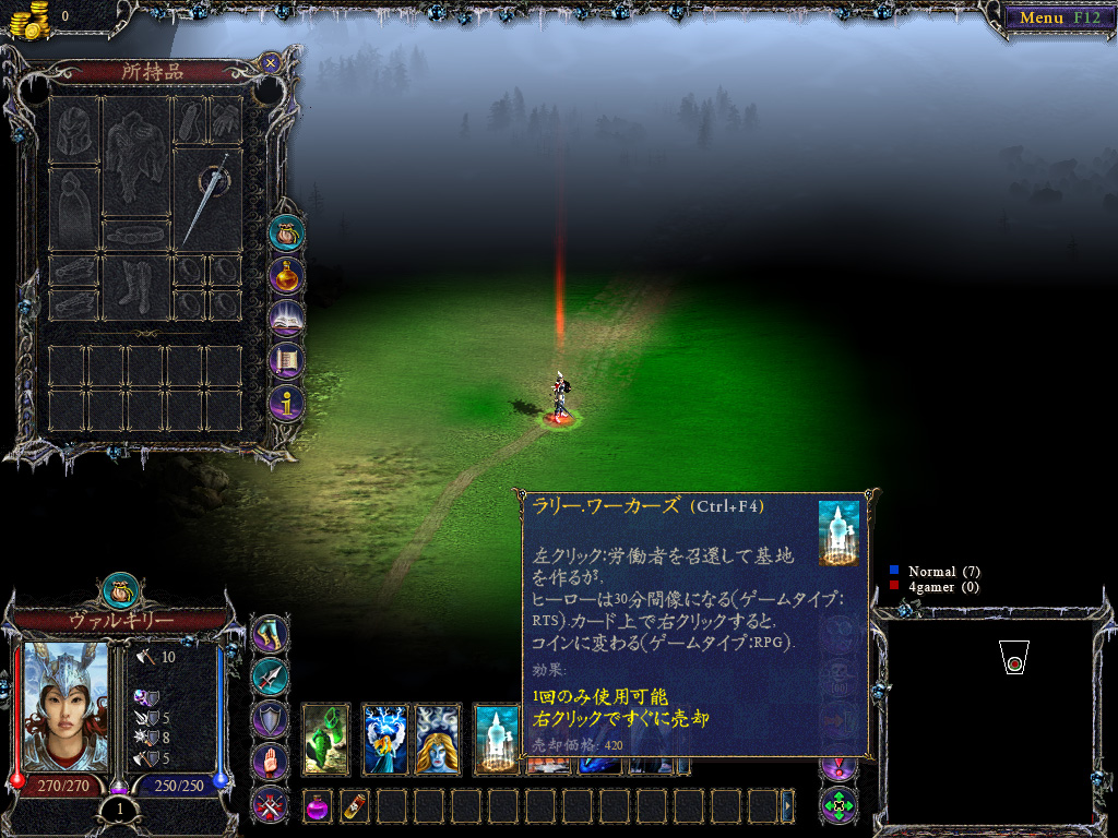 もちろん「ラリーワーカーズ」を使用せず戦うこともできる。その場合は「ラリーワーカーズ」を換金して(残しておいてもいい),ヒーローを育成しながら戦う。ヒーローは普通のユニットとは異なり,戦いを重ねることでレベルアップするし,マップ上のショップで武器/防具/魔法/ポーションなどを売買したり,NPCモンスターがドロップするアイテムを入手したり,カードを駆使して有利に戦闘を進めたり,中立勢力にお金を払って味方に付けたりできる。さらにヒーローは,死んでもライフ(ゲーム開始前にライフの数を3/5/7から選択)の数だけ復活できる。ヒーローをじっくりと鍛え上げれば,1000体以上の敵とも互角に渡り合えるようになるだろう。そこまでいけば,非常に爽快感あふれるバトルを楽しむことができそうだ。