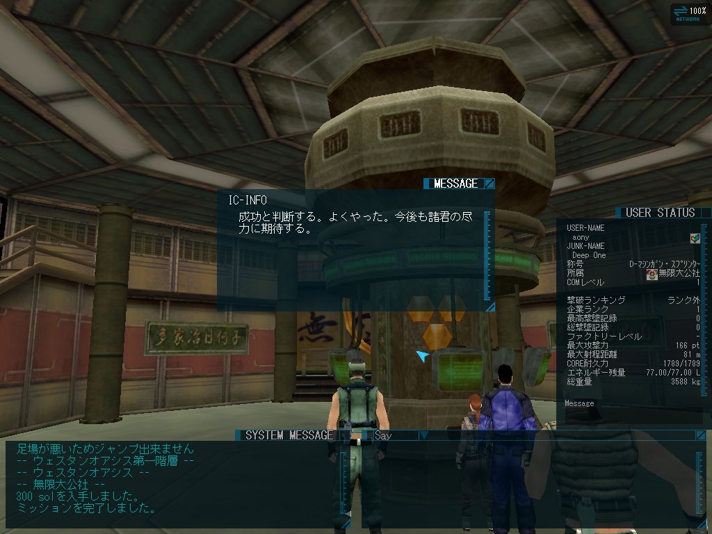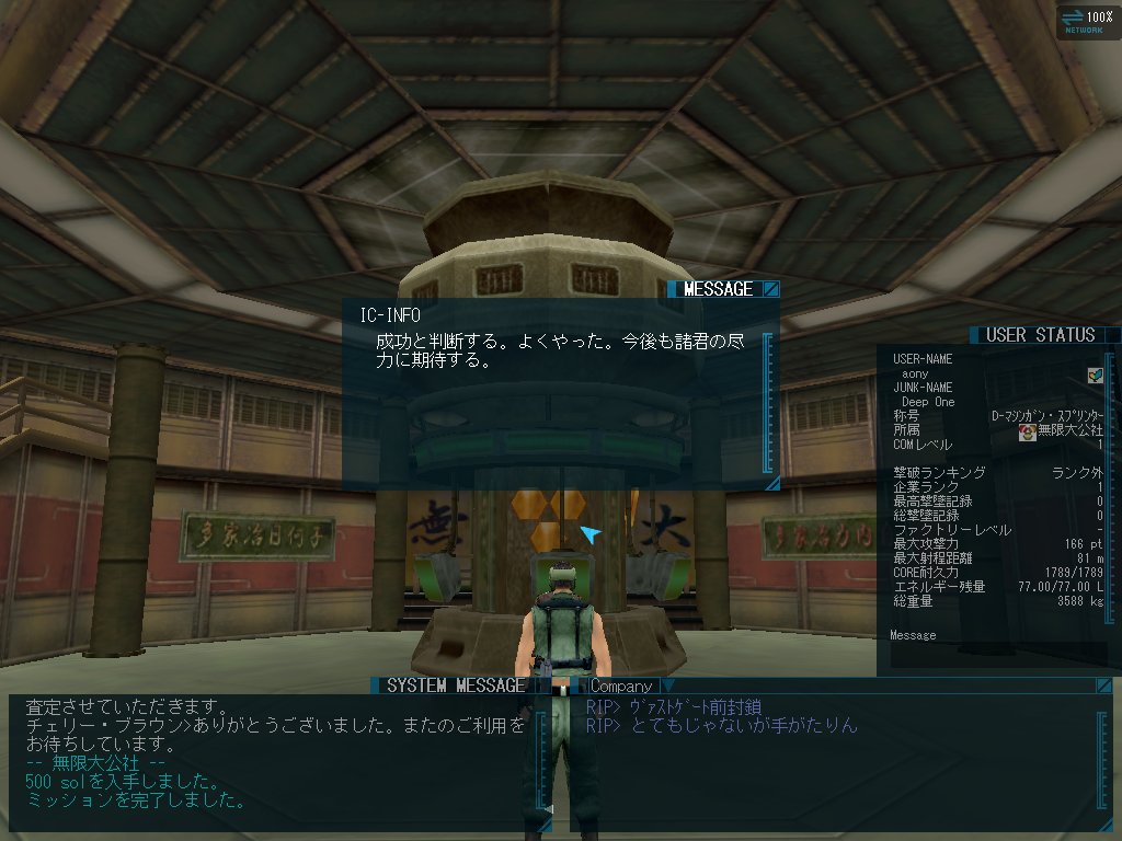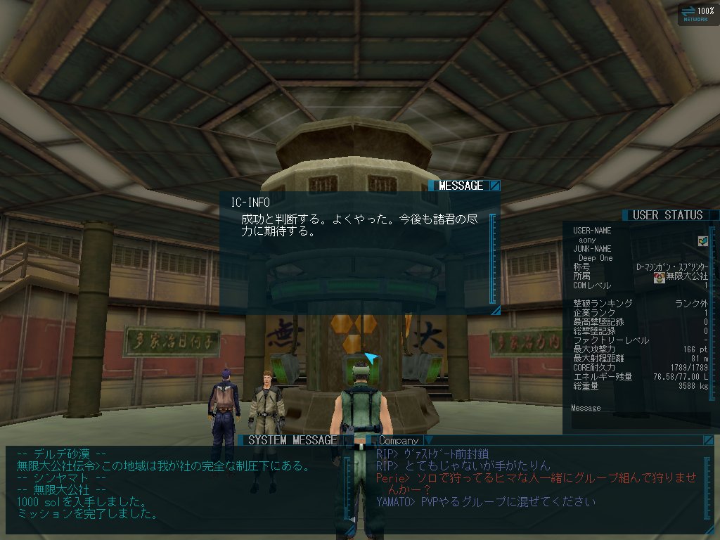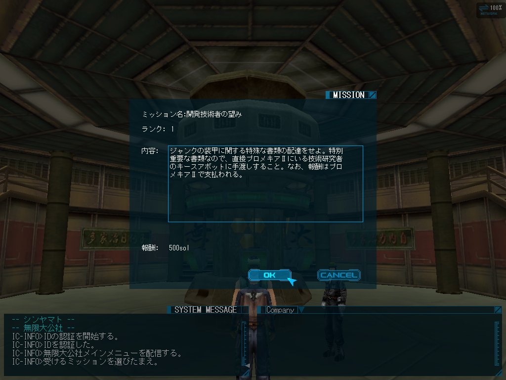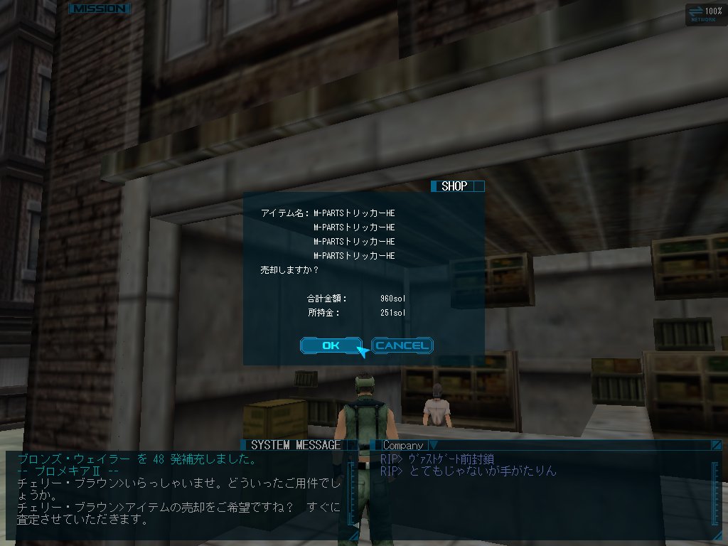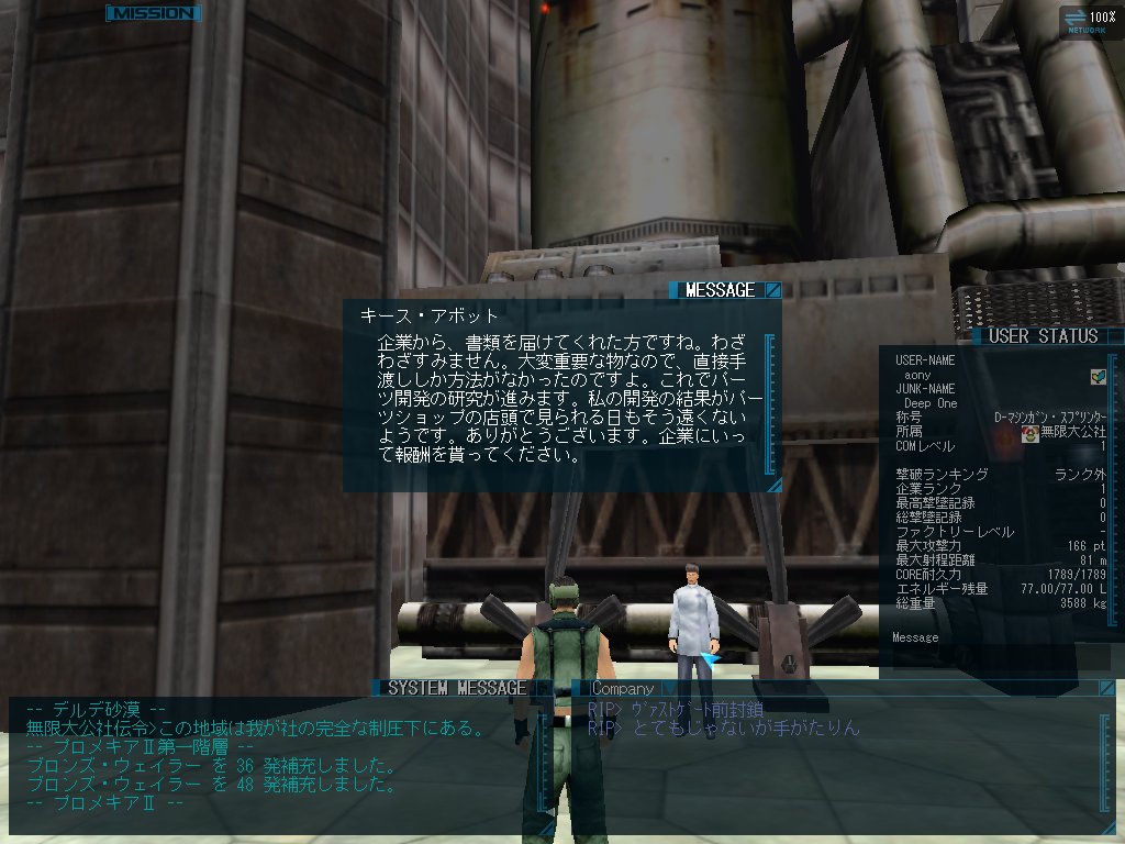 そんな面白イベント(?)を観戦しつつ,ウェスタンオアシスへ到着。無限大公社で報酬を受け取り,「プロメキアII輸送指令」を受けた。デルデ砂漠に出撃し,強そうなグールを避けながら直進していくと,意外と簡単にプロメキアIIに到着した。先ほどと同様に無限で報酬を受け取り,今度は「プロメキアII→シンヤマト」を受ける。そしてデルデ砂漠に出た直後,RETREAT。ホームポジションであるシンヤマトで報酬を受け取り,お次は「開発技術者の望み」を受けた。 ……ここまでやってみて,新兵にとってのお使いマラソンの重要性が,ようやく理解できた。なるほど,確かにグールハントよりも効率がいい。お使いの途中にグールを狩ったり,気分転換に「トリッカーテスト」を受けるなどすれば,さほど退屈でもない。これなら思ったよりも早く,キットバッグJM-Aを購入できるかもしれないな。 というわけで続きは次回。新兵の諸君も,お使いミッションをぶんまわしてsolを貯めておいてほしい。 なお今回は「こちら」に,JUNKMETALに登場するパーツのリストを掲載した。また次回は武器データを掲載する予定だ。こちらもお楽しみに。