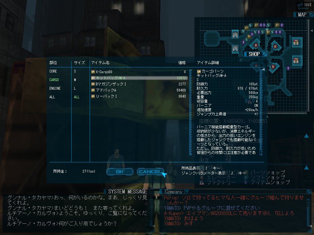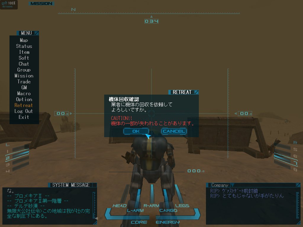 これは今のうちに稼ぎまくっておかなくては! と思い立ち,手当たり次第にお使いミッションしたりグールを倒したりしていたのだが,どうにもこうにも効率が悪い。まず自機の武装が貧弱なので,リトリ砂漠にポップするトリッカー相手にも無傷では勝てないし,グール撃破後にパーツを入手できる確率も,さほど高くはない。また,逆関節タイプのアルトルビーノ・オーロを購入したものの,お使いミッションでの長距離移動がしんどくてしんどくて……。 ただ闇雲にプレイするのではなく,ある程度計画的になったほうがよさそうだ。と今更ながら気づいたド素人であるところの筆者は,ド素人なりに序盤の貯蓄プランを考えてみた。 まず,sol稼ぎはお使いミッションをメインにする。現在の武装では,リトリ砂漠でグールハントしても消耗が激しいし,グールからのドロップに頼っていると収入が不安定になるためだ。それに燃料の補給やパーツの修理を無償で受けられるサービスが,「COMレベル3になるか,敵ジャンク3機を撃破するまで」なので,無闇なグールハントはのちのち自分の首を絞めることになりかねないからだ。 お使いミッションは,RETREATコマンドを有効活用しつつ,連続的に受けたい。いろいろと試行錯誤してみた結果,シンヤマト〜リトリ砂漠〜ウェスタンオアシス〜デルデ砂漠〜プロメキアIIというルートが比較的安全だったので,シンヤマトをホームポジションにし,シンヤマト,ウェスタンオアシス,プロメキアIIで受けられるお使いミッションをとにかく繰り返す。ちなみに各拠点で受けられるお使いミッションは, ■シンヤマト「シンヤマト→ウェスタンオアシス」……目的地ウェスタンオアシス,報酬300sol「開発技術者の望み」……目的地プロメキアII,報酬500sol ■ウェスタンオアシス「プロメキアII輸送指令」……目的地プロメキアII,報酬300sol■プロメキアII「プロメキアII→シンヤマト」……目的地シンヤマト,報酬1000solとなっている。これらのお使いミッションを自分なりに組み合わせ,「プロメキアII→シンヤマト」を受けた直後にRETREATすれば,お使いの効率はかなりいいといえるだろう。 ちなみに各ミッションは,ゲーム内で1日(現実時間で90分)経過するか,ミッションを5種クリア(キャンセルしてもいい)すると最初にクリアしたミッションから復活するので,お使いミッションの無限往復が可能である。所持金が3万solを超えるとお使いミッションが受けられなくなるのだが,そんな先の話は気にしないことにしよう。筆者は気にしないようにした。 さて,計画通りにお使いミッションマラソンができれば,solはみるみる貯まっていくはずだ。そのsolの最初の使い道は,さらなるお使いミッションの効率化を図るため,キットバッグJM-A(12800sol)とする。このパーツはバーニア付きのカーゴで,耐久力や収容量はやや低いものの,ジャンクの機動力を大きくアップしてくれるらしいのだ。コイツを愛機に装着すれば,お使いミッションからの卒業も早まること請け合いであろう。