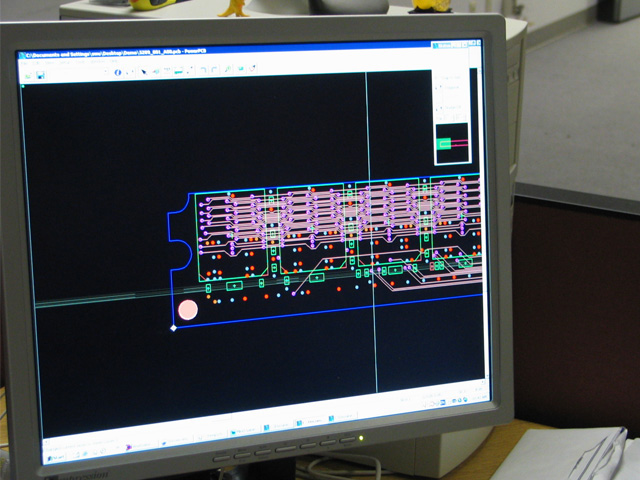 左がロードボードだ。ロードボードの中心にメモリチップを置いてテストする。中央の写真を見ると分かるように,テストに当たっては上からしっかりと固定することになる。ちなみに,写真撮影はできなかったが,某次世代メモリチップ/モジュール用のロードボードももちろんあり,IntelとKingstonの関係の深さがうかがえた。右はメモリ基板設計中の様子