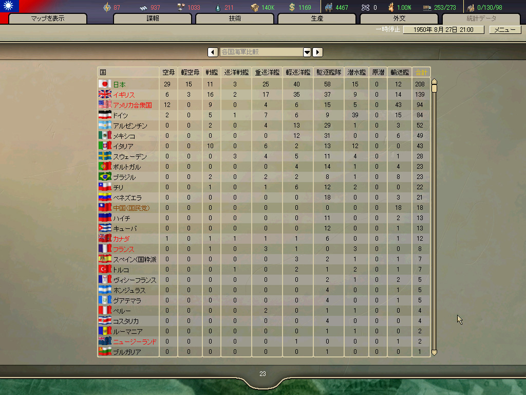 連載の最終回,汪兆銘傀儡政権のときに日本がすさまじい数の空母を持ってましたが,これはAIが陸海空の軍事ユニット比率を守るように出来ていて,そこでいらん国が空軍ユニットをガンガン輸出したせいで,海軍が無駄に拡張されたせいでしょうし。