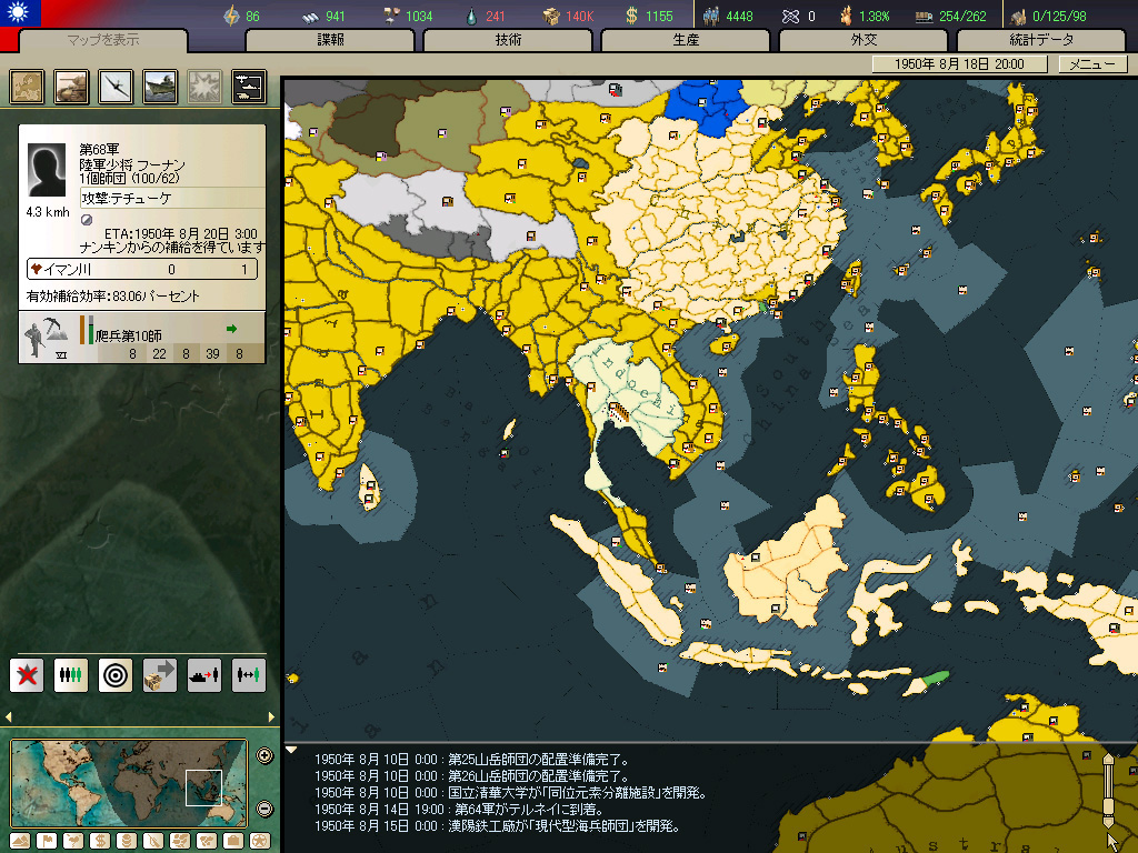 AIはユニットが輸出で増えたと認識してないですからね。それでとにかく船は増やすけど,艦載機のいない空母とかが現れる。艦載機も一緒に供与しないとね。まあしかし,あれだけプロヴィンスがあって,個々の戦闘結果も記録しながら,重要なプロヴィンスをきちんと割り出して動いてるだけでたいしたものだと思います。