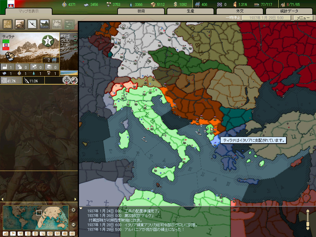 そして,ユーゴ消滅の布石となっているのがアルバニアです。これが無事イタリアの手に収まっていれば,ルーマニアも枢軸側として参加し,結果としてユーゴは消える。これらがきちんと動いているときは「ははあ,そういう流れか」と納得がいくのですが。