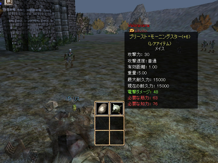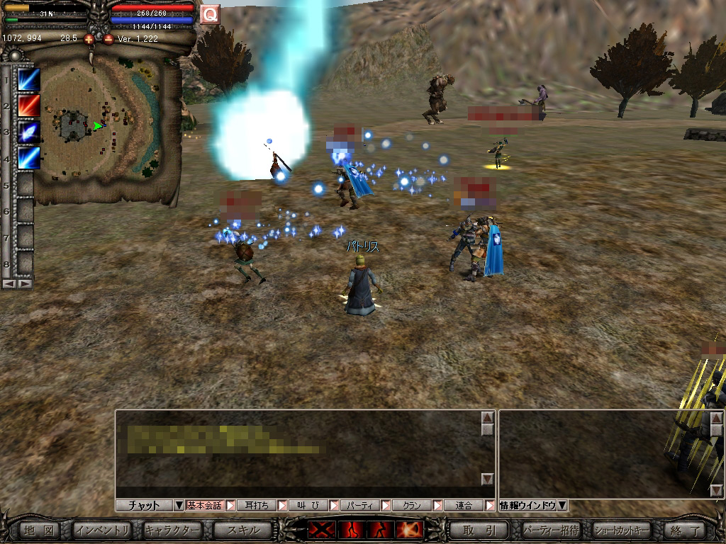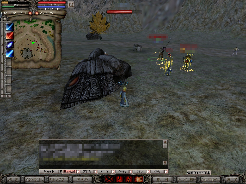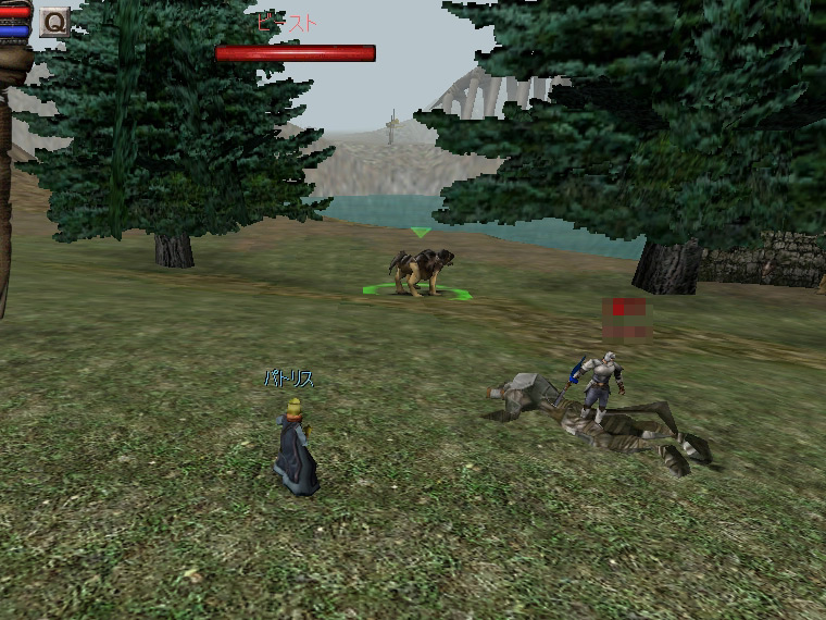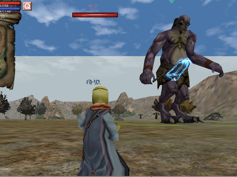 またPvP可能エリアということもあり,細心の注意を払って移動していたのだが,マップ中央のユニークモンスター出現地域にて,エルモラドパーティとカルスパーティの戦闘現場に直面。本作での初PvPにやや興奮したものの,己の装備の貧弱さを思い出してグッと我慢。人間族と魔族の激しい戦闘をこっそり眺めつつ,戦線離脱したのであった。
