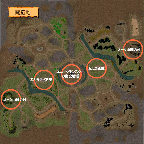 | これが開拓地帯のマップ。ユニークモンスターの出現地域を挟んで,西にエルモラド本陣,東にカルス本陣が設置されている。当然PvPはユニークモンスター出現地域で頻発するので,純粋にモンスターハントを楽しみたいなら,無難に味方国本陣の周辺で戦おう |