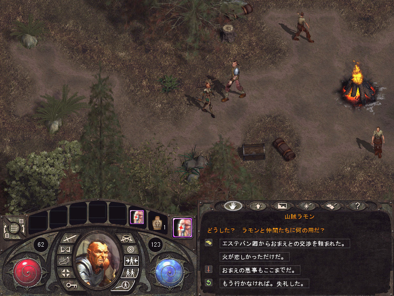 「笑う盗賊」ラモンが率いる盗賊団は,マップの南東部,エステバン卿がいるあたりからまっすぐ下に行ったところにいる。力ずくで退治してもいいし,十分なCommunicationスキルをもっているなら説得して追い払うこともできる。こちらも,任務を達成したら卿に報告しよう。