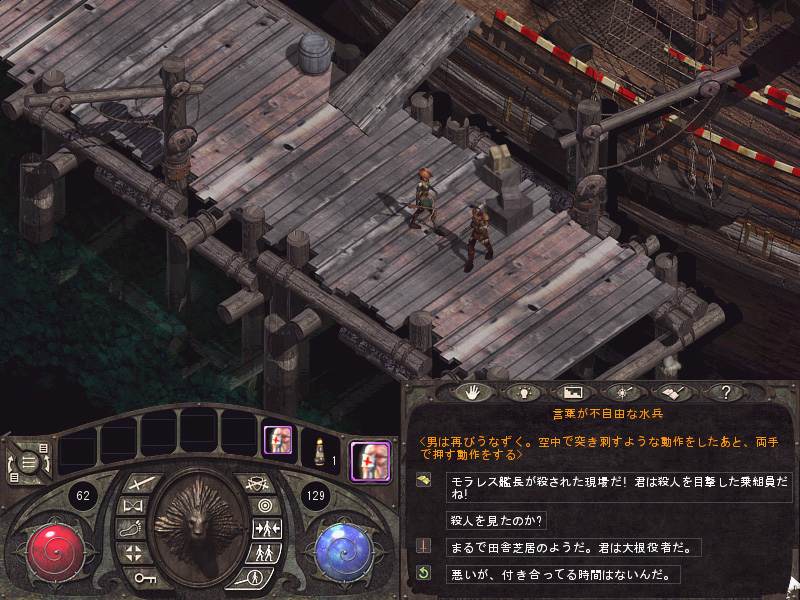 | 港湾地区に赴き,桟橋にいる言葉の不自由な水兵と,酒場にいる魔人族の水兵に,殺人事件についての聞き込みを行おう |