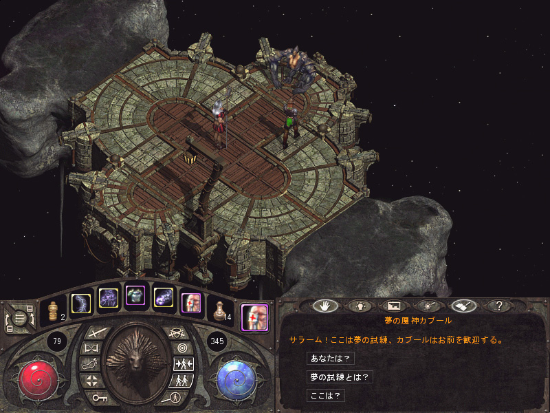 - 異次元の「夢の魔神の家」に飛ばされ,夢の魔神カブールに会う。試練には,モンスターと4回戦闘を行う「力の試練」と,カブールの三つの謎かけに答える「知恵の試練」の2種類があり,どちらか一方を選ばなくてはならない。「力の試練」をクリアすると戦闘スキルがアップし,さらに聖なるシミターをもらえる。「知恵の試練」をクリアすると,基本能力値IntelligenceとSpeechスキルがアップする。