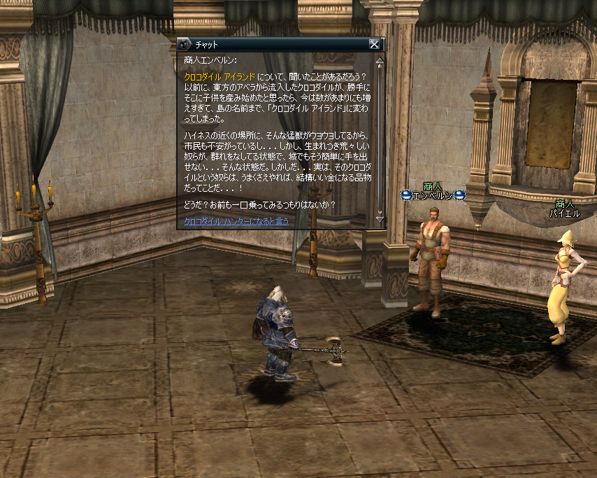 | 商人エンベルンから始まるクエストが,このクロコダイルハンターになるクエスト。クロコダイルアイランドは,元々クロコダイルの住処ではなかった。現在のように大量に住み着いているクロコダイルを退治して平和と取り戻してほしいという内容だ。ハイネス住民の不安を取り除くと同時にお金稼ぎができるというクエストとなっている。 |