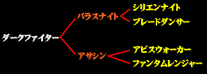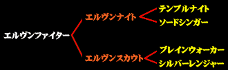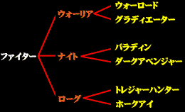 このジョブチェンジは,2系統に分岐(種族によって異なる)していて,ファイターは近接武器を使用した直接攻撃系と弓を使用した遠距離攻撃系,メイジは攻撃魔法系と回復魔法系というイメージが強くなり,それぞれ初期職業よりも専門的なスキルを習得していく。