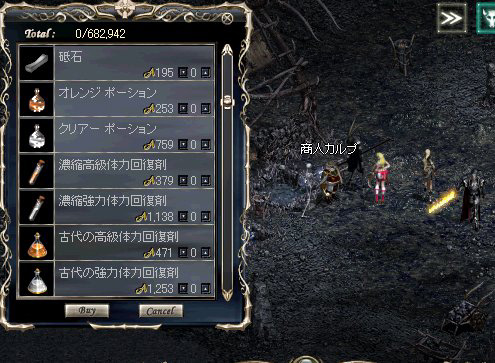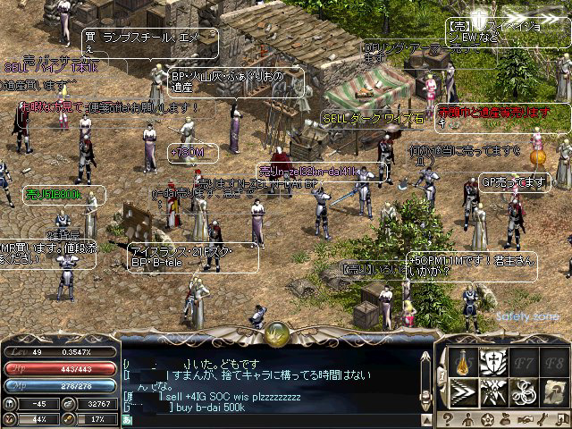 ただし,これもほかのMMORPGでよくあることだが,表示メッセージと実際の値段が違う,人気アイテムを装って似たようなアイコンのアイテムを出品するなどという詐欺行為が,ごくわずかながら存在するようである。買い物のときには,値段やアイテムをよく確かめる癖をつけておいたほうがいいだろう。