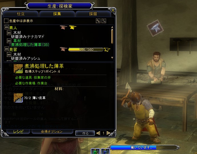 採集は,横たわる木々から材木を切り出したり,動物から手に入れた皮革をなめすスキル。その加工された革は,仕立,鋳造,鍛冶と多岐にわたり利用される。なお,材木を加工するにはNPCからロウを購入する必要があり,コストはやや高くなってしまう。皮革は,獣系を倒せば手に入るので,ある程度の数量であれば,冒険の中で自然と入手できるだろう。