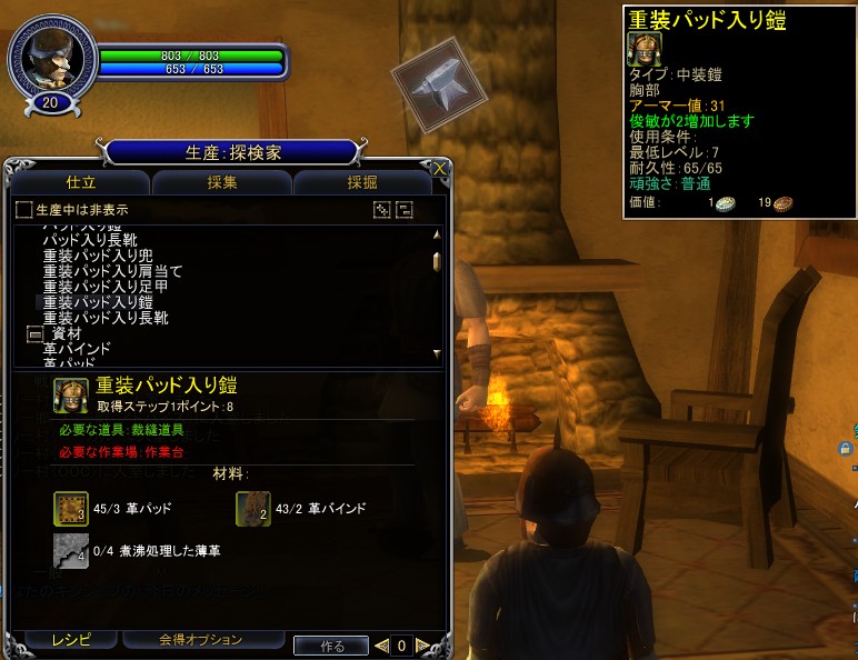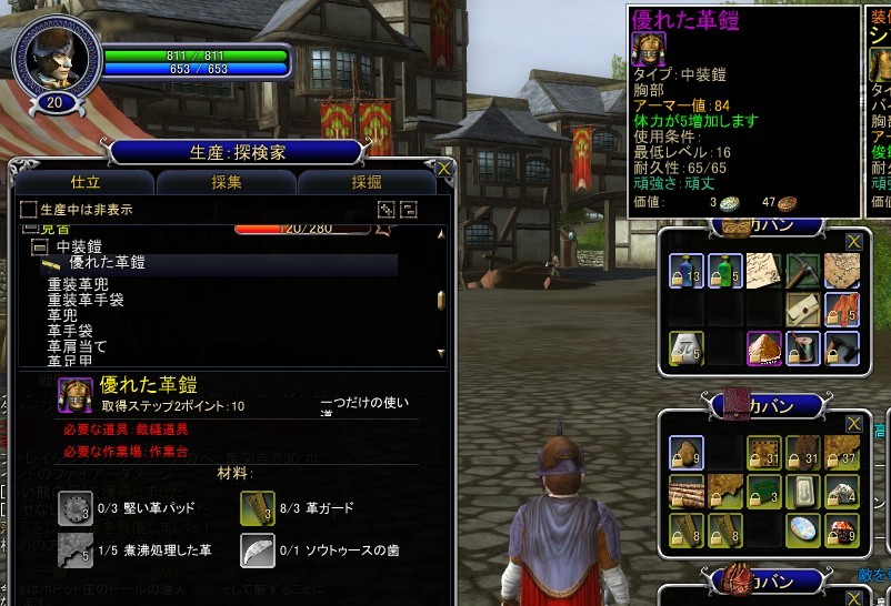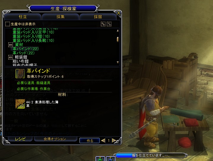 布や皮で作られた軽/中装鎧を作成するスキル。材料となるのは,革だ。探検家ならば,皮革の採集と革への加工,そして製品への加工と,布をNPCから購入することを除けば,ほぼ自給自足で生産できるので,仕立を極めんとする人にお勧めだ。