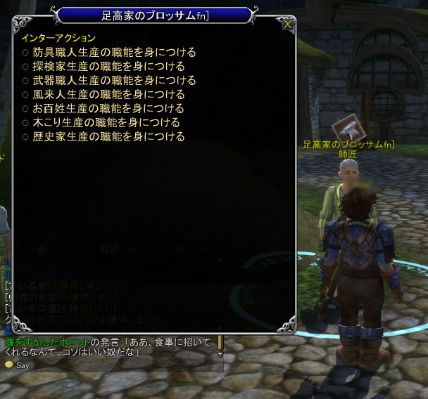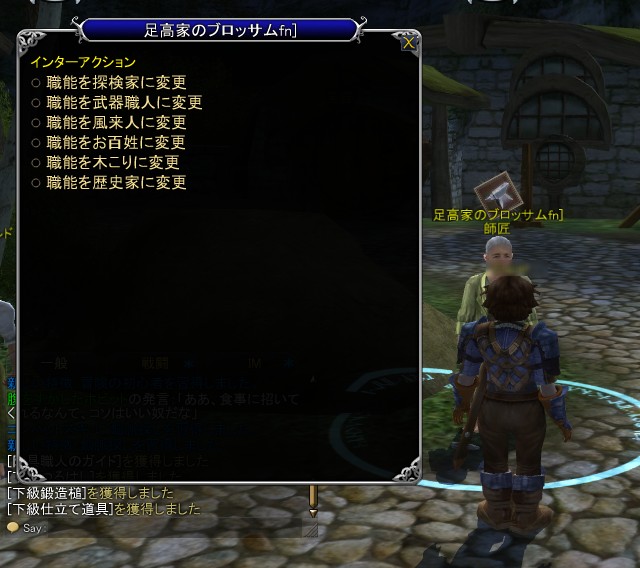 チュートリアルである最初のエリアを終え,それぞれの種族のスタート地点からしばらく冒険を進めていくと,大きめの街(村)で,クラフト広場を見つけることができる。そこにいる,師匠というタグがついたNPCに話しかけると,七つの職業が表示されるので,就きたい職を選択しよう。なお職業は,あとからでも師匠に変更してもらえる。しかし,新しく就いた職業に存在しないスキルは,覚えたレシピ,経験値がリセットされるので注意しよう。