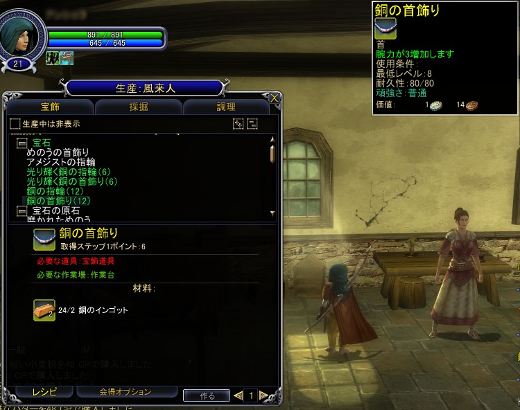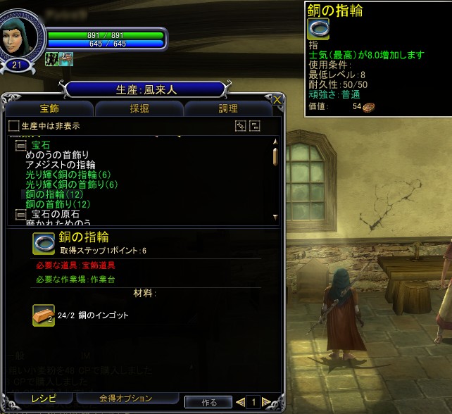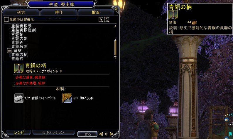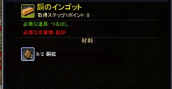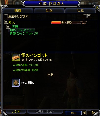 なお,右側の画面で取得ステップ1ポイント:8と書かれているのは,そのアイテムを作成したときに得られる経験値だ。この経験値を初期であれば200ポイント溜めると,そのステップを修得できるというわけだ(つまり,画面の「銅のインゴット」であれば,25個[8×25=200ポイント]作ればよい)。