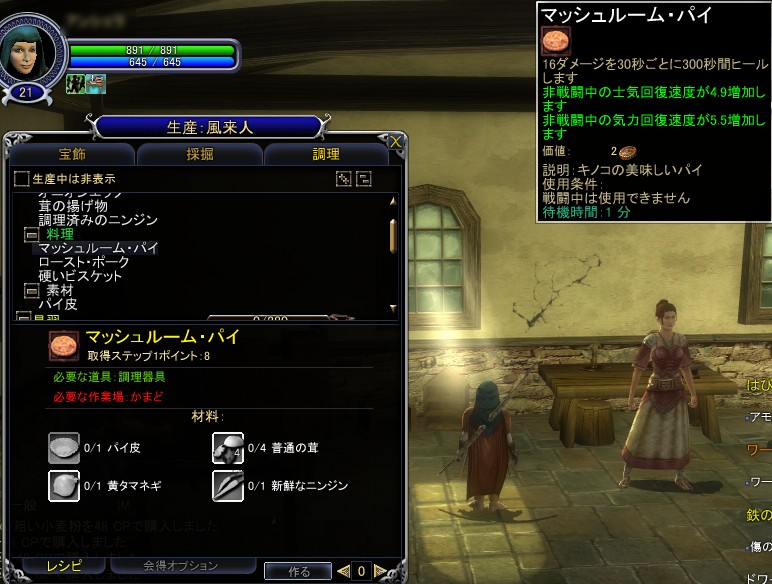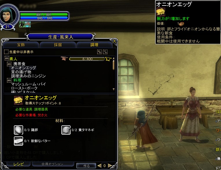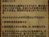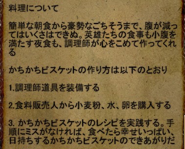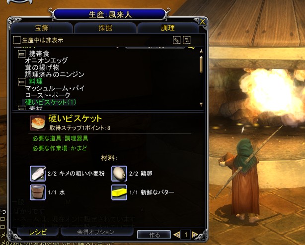 では,先ほどのガイドに書かれたレシピを参考にして素材を集めて,“商人”や“業者”などのNPCから材料を購入して作ってみよう。今回は,材料のすべてをNPCで賄える調理スキルで,ビスケットを作ってみる。