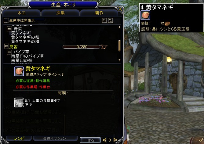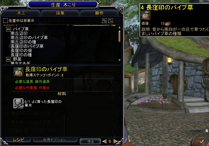 耕作は,農業用水と肥料をNPCから購入するため,序盤で育成するにはお金がかかりすぎてやや辛い。なお,素材獲得スキルの一種なので,修得クエストなしでステップが上がる。