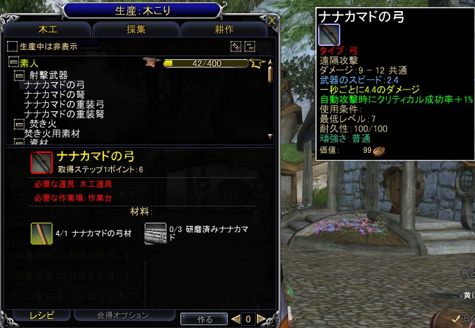 木材を削り,弓に,杖にと木製の武器を作成するスキルだ。材料はもちろん木材で,採集で集めた材木をロウで加工したものを使う。加工にNPCから購入するロウが必要なため,全体的にコストが高くなってしまうところが序盤ではやや難点である。また,槍など金属を使うものや,鋳造の製品を利用するものがある。なお,調理で必要になる“焚き火用素材”の作成には,加工前の“ナナカマドの枝”が必要になる。