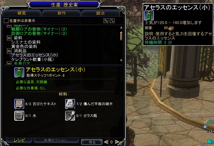 研究は染料以外の素材を集めるには,歴史家の天眼鏡が必要なため,ほかの職業の人からの供給は,人型モンスターやボックス(箱,繭など)からドロップした素材に頼ることになる。鍛冶や染料のために採掘,採集スキルを持っている探検家と組むのが良いだろう。