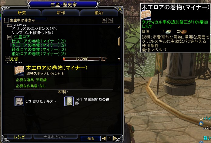 古代の知識を研究し,巻物(ロア)にまとめたり,薬剤を作成するスキル。素材となる研究物は,遺跡や廃墟などで発見できるシャッタード・ピッチャーなどから手に入るが,そこから入手できるのは歴史家だけのうえ,その数は多くないため,素材集めにはやや苦労することになりそうだ。