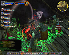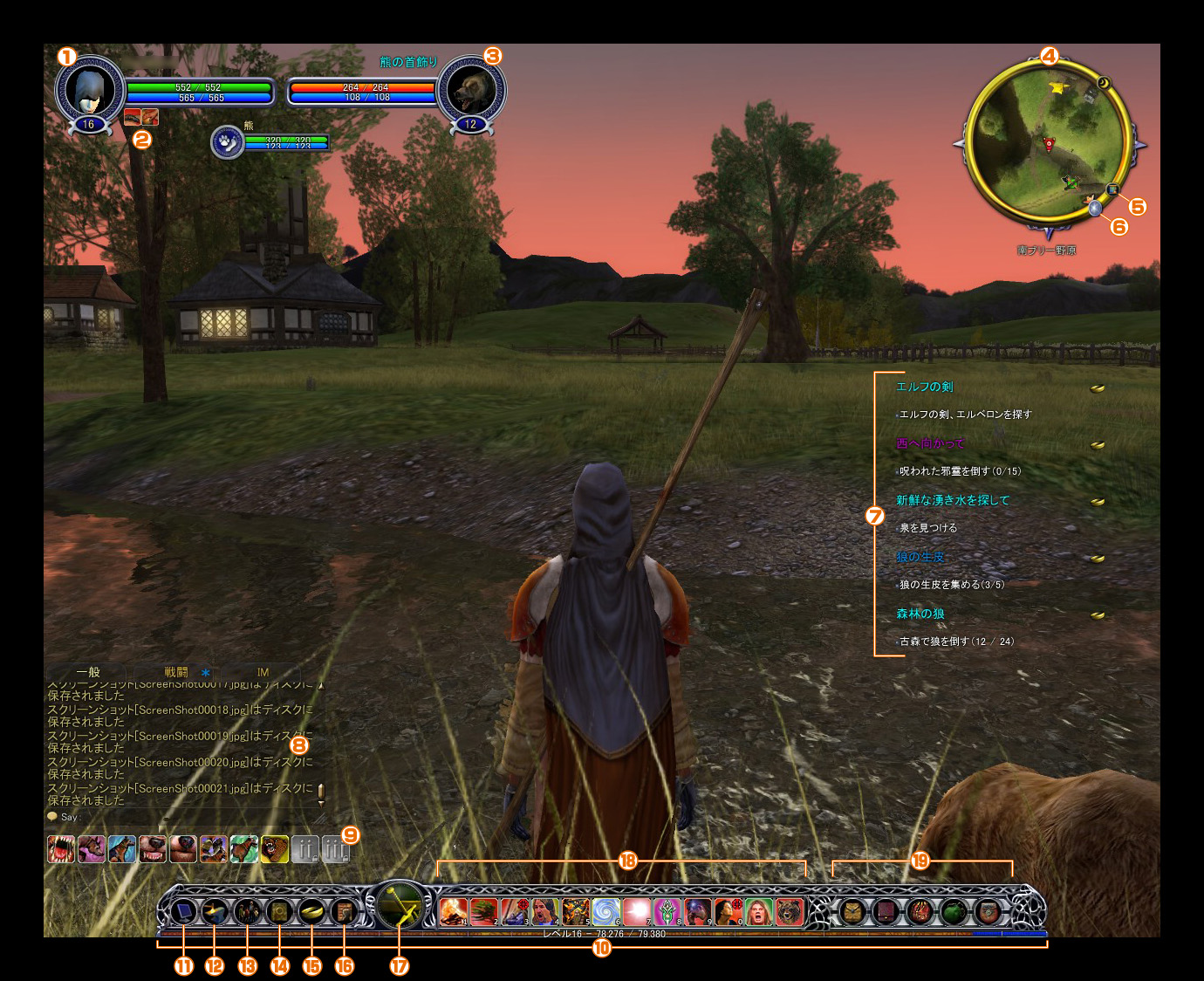 - (11)メインメニューボタン。ヘルプやオプション,キャラクターのログオフ,ゲームの終了などのサブメニューを表示するボタン