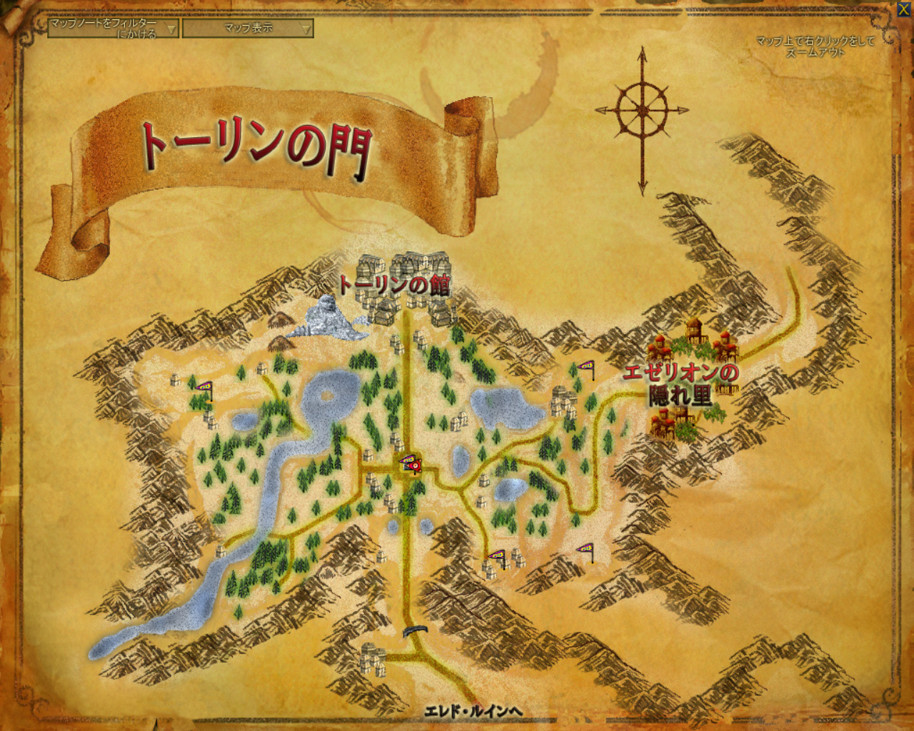 マップの中央には,フレリンの中庭とよばれる広場がある。クエストで東西南北を走り回るプレイヤーが必ず通過する場所だ。なお,エルフを選択したプレイヤーとドワーフを選択したプレイヤーでは,ゲームのスタート地点が違っているが,トレーナーやアイテムショップなどは,それぞれのスタート地点に揃っている。